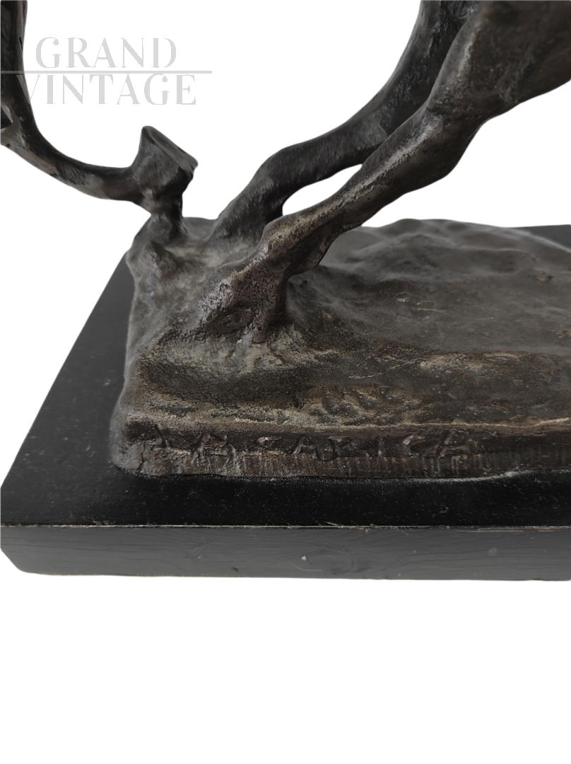 Scultura in bronzo patinato raffigurante un cavallo al galoppo, l'opera reca il titolo La Carica inciso in basso, e poggia su una base in legno. Buono lo stato di conservazione.