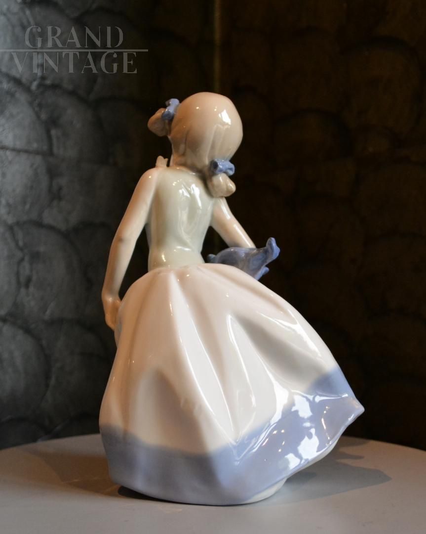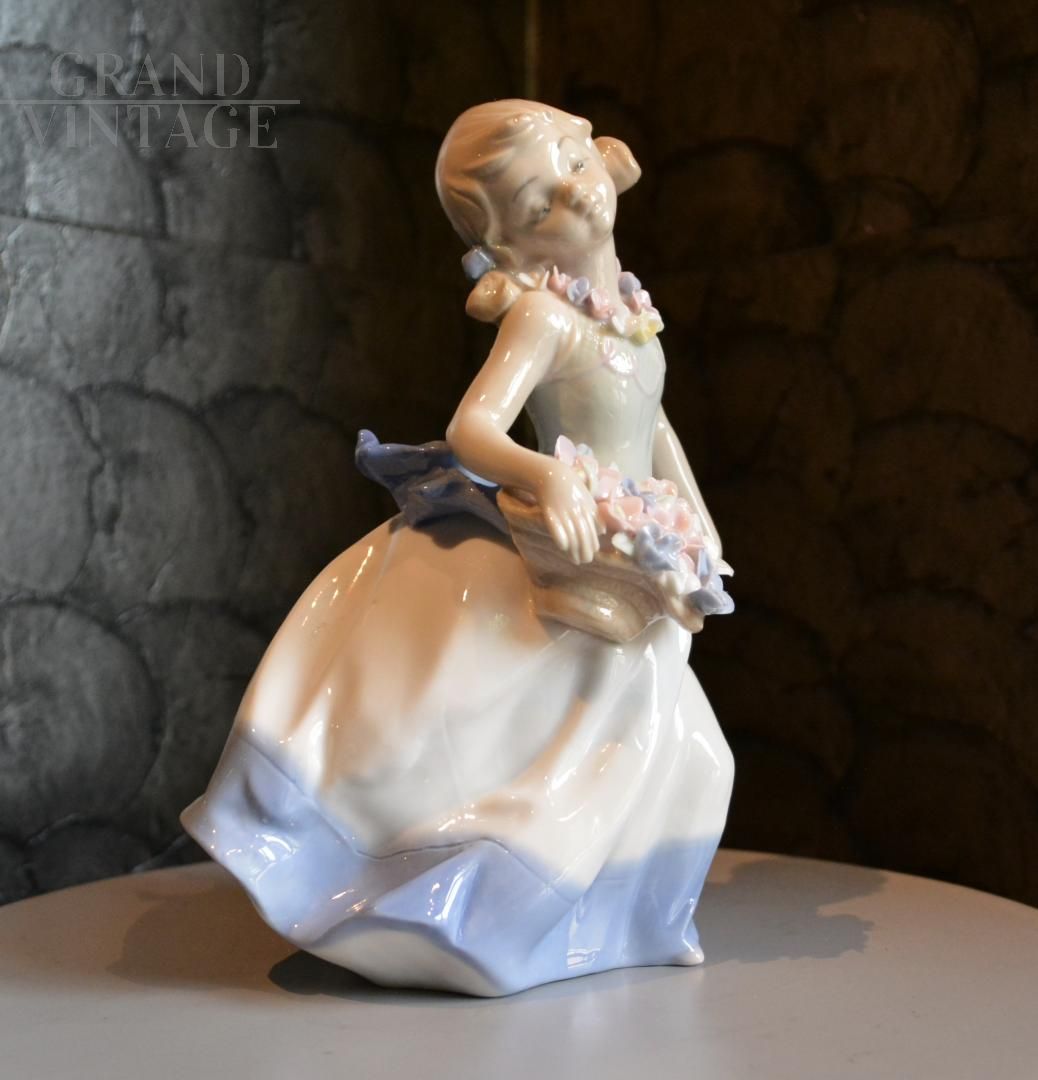 Scultura in porcellana vintage, ragazzina con cesta di fiori