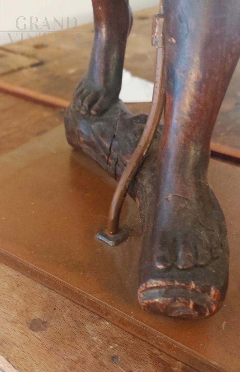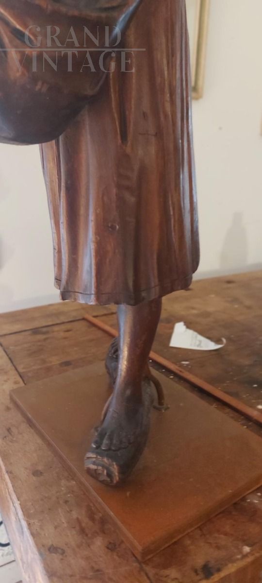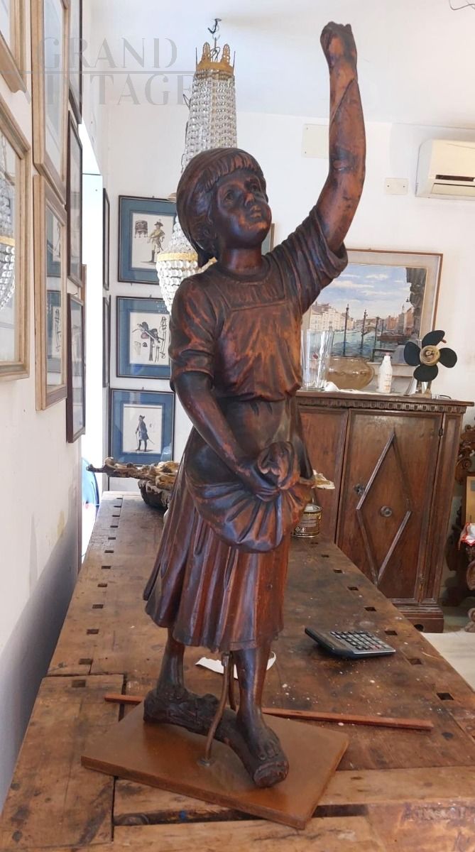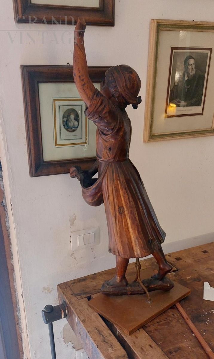 Scultura in legno di cirmolo raffigurante una donna raccoglitrice di olive posta su base metallica di epoca successiva. Unico difetto: una mano senza dita, come da foto.