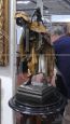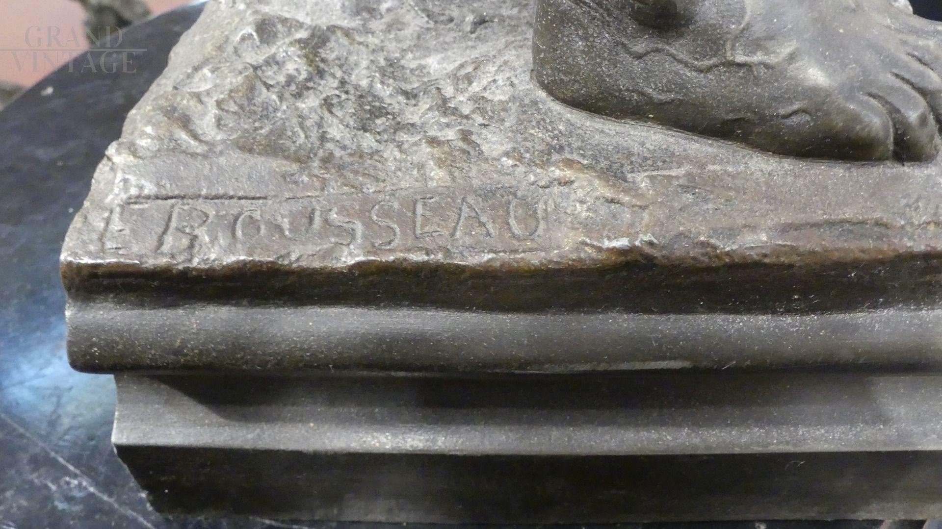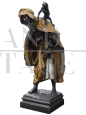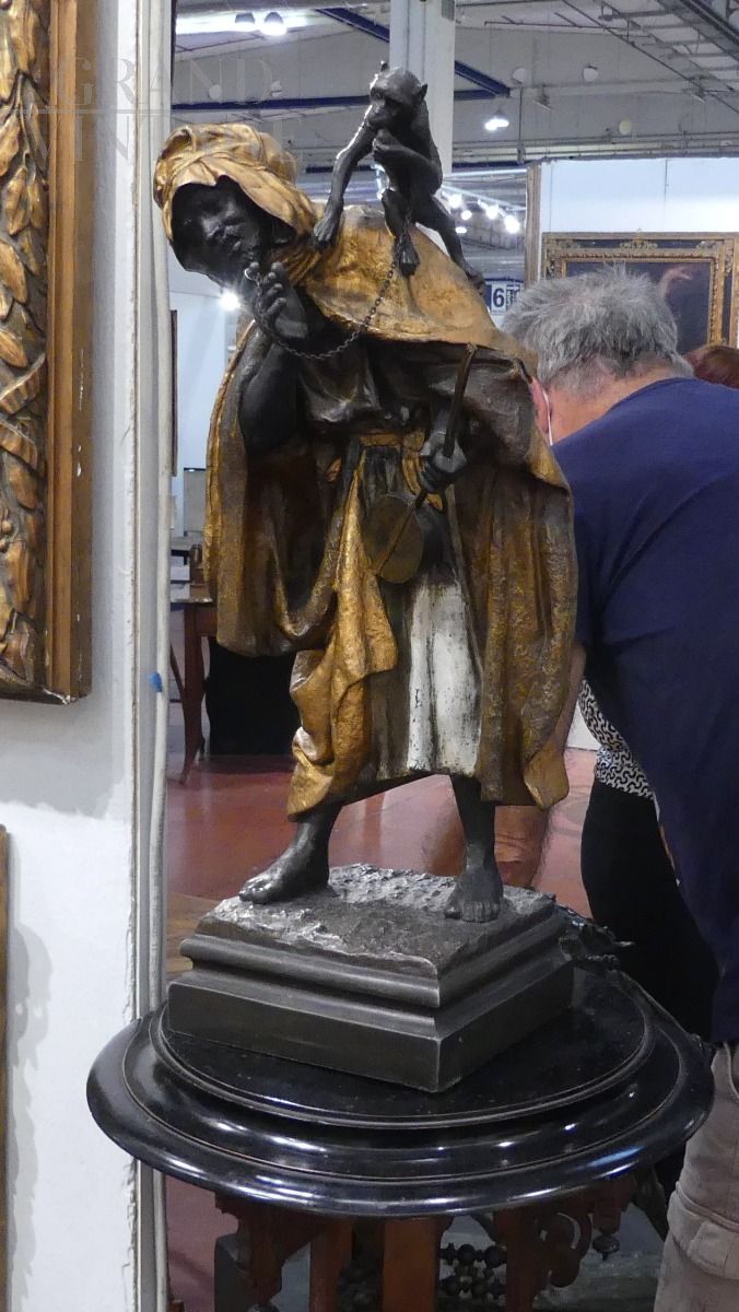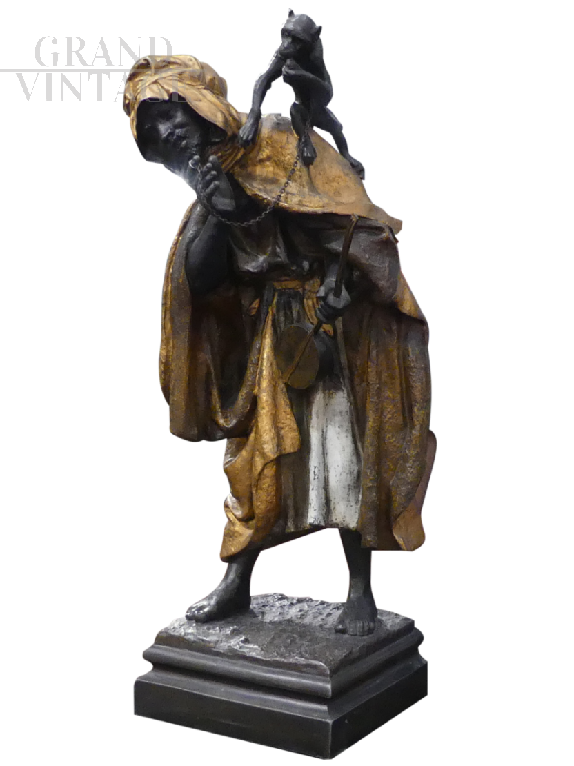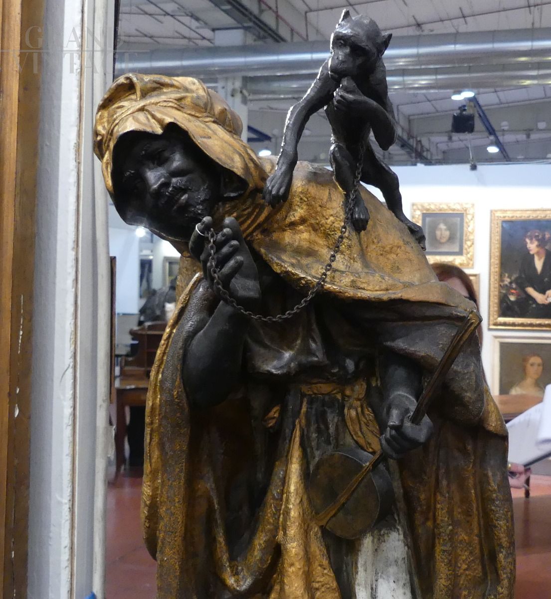 Scultura firmata Russeau originale, raffigurante un mendicante mediorientale con una scimmietta sulla spalla e uno strumento a corde in mano, in bronzo con magnifici dettagli dorati.