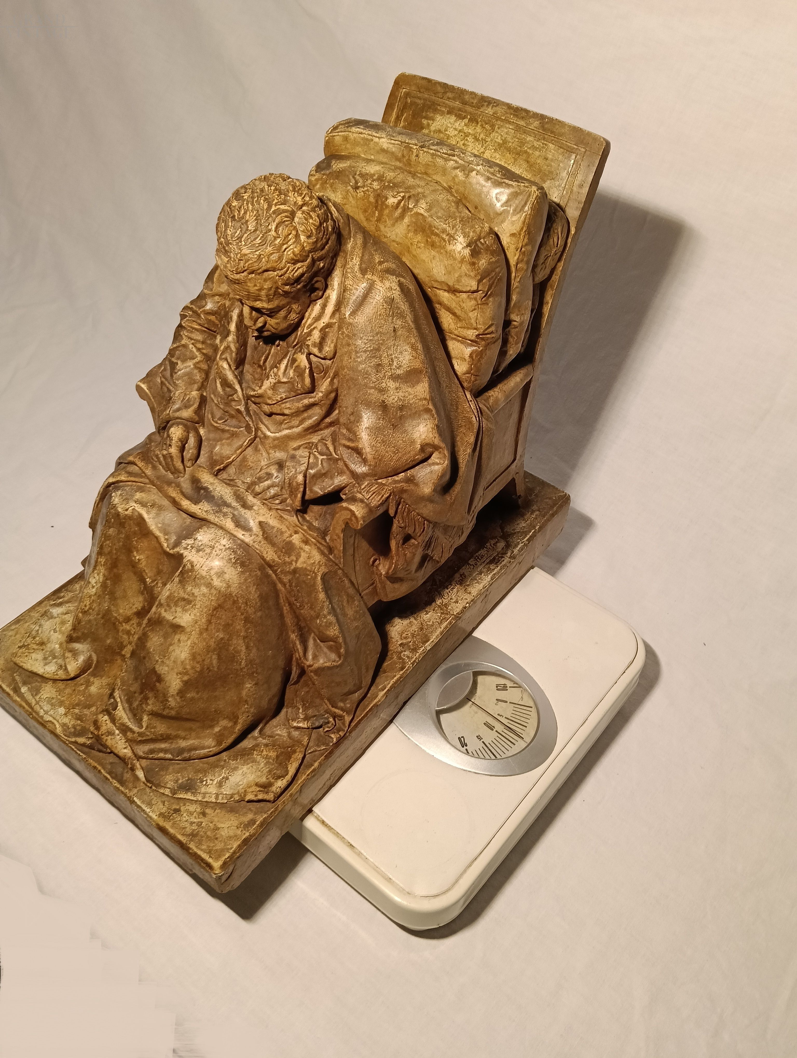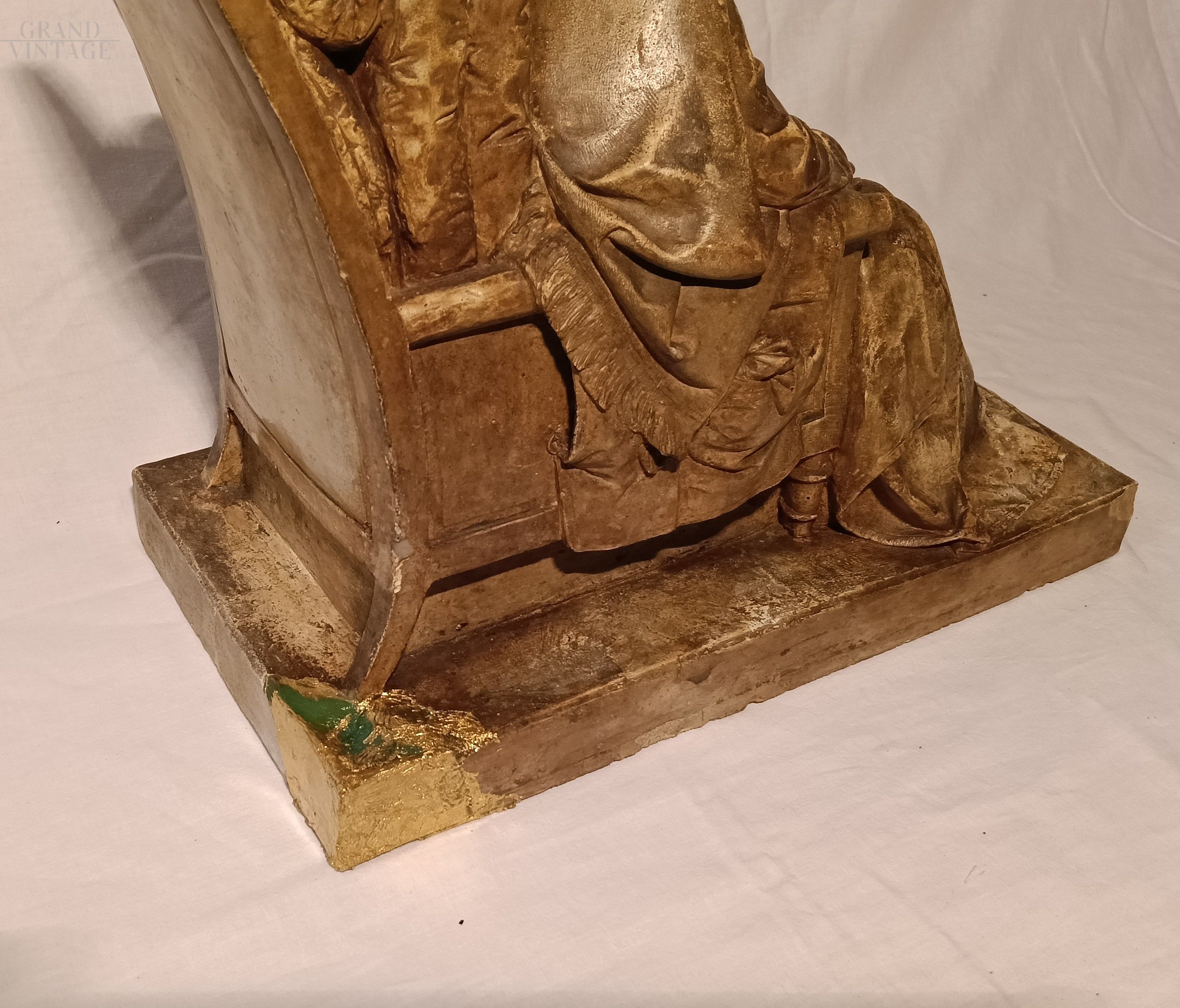 Riproduzione scultorea in pietra vetriata e gesso rinforzato, copia del Ritratto Virile Sedente di Vittorio Alfieri, realizzato da Pompeo Marchesi (1840 circa). Firma sulla base "Ariodante Botta di ce...". Presenta uno spigolo riparato in foglia oro come da foto. Scultura molto pesante.