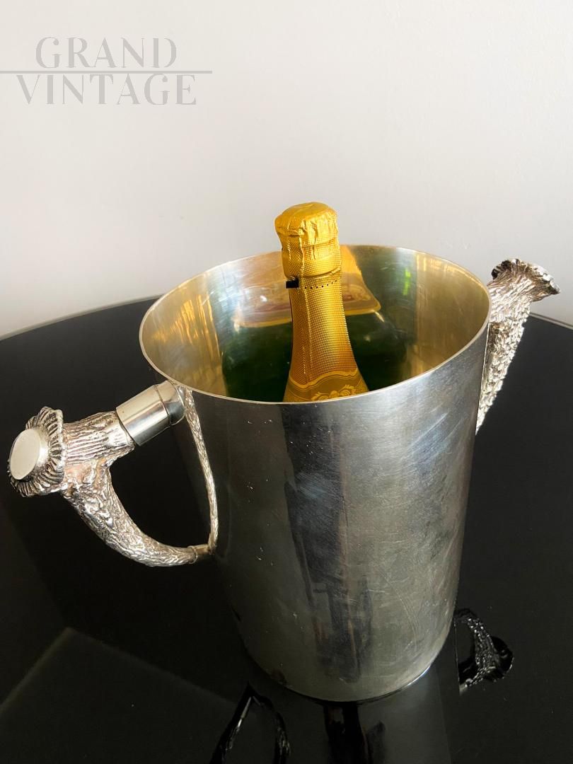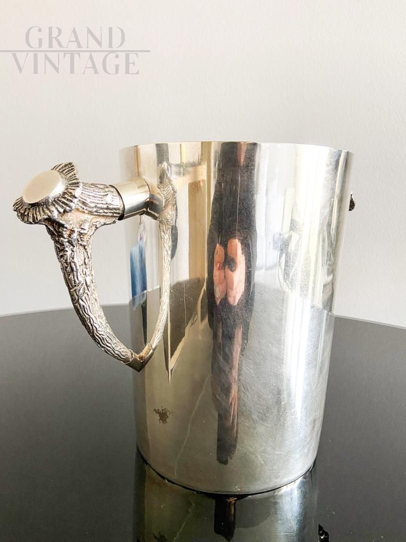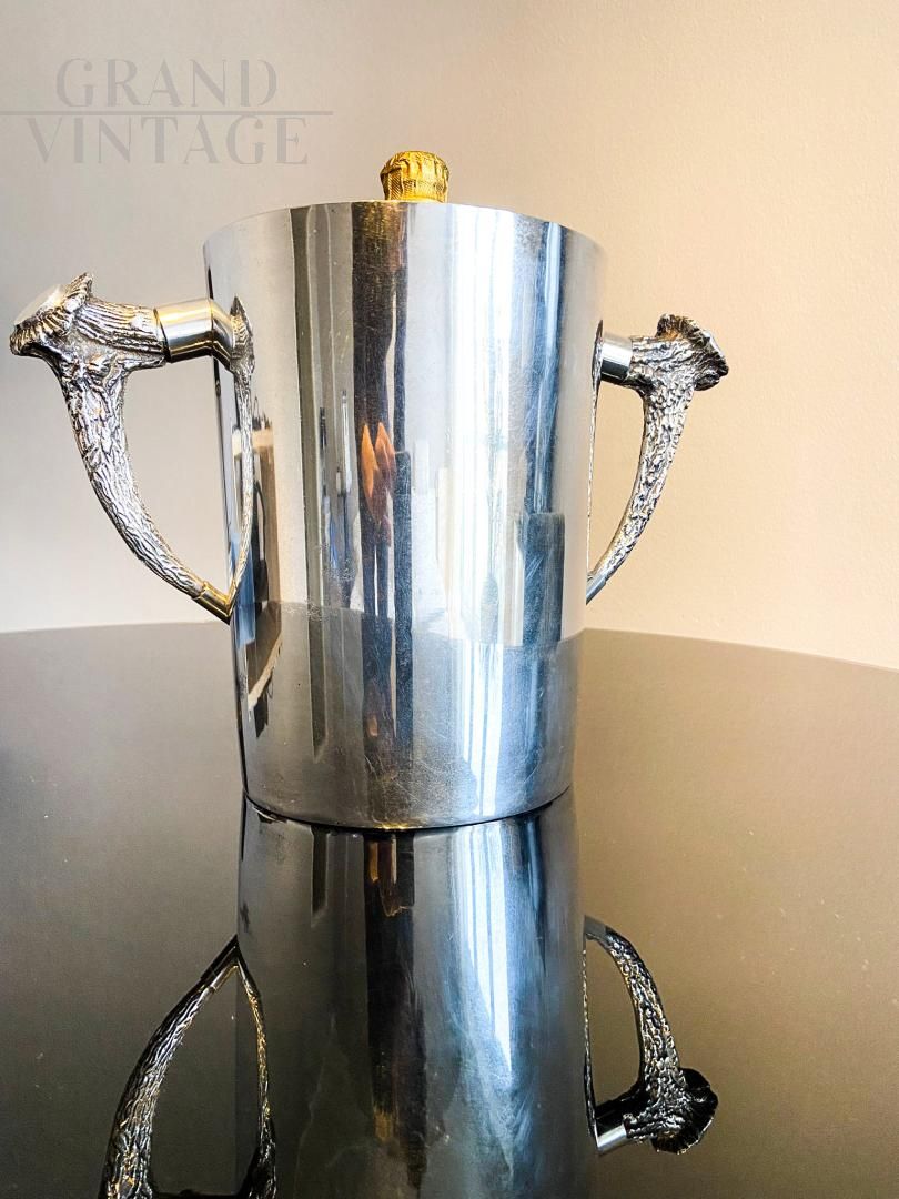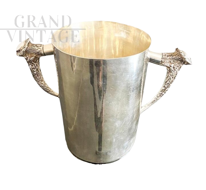 Secchiello per il ghiaccio Ralph Lauren placcato in argento con maniglie a forma di corna di cervo. Il secchiello per il ghiaccio è alto e rotondo, con i lati dritti e manici finemente decorati, ed è contrassegnato con "Ralph Lauren". In buone condizioni.