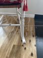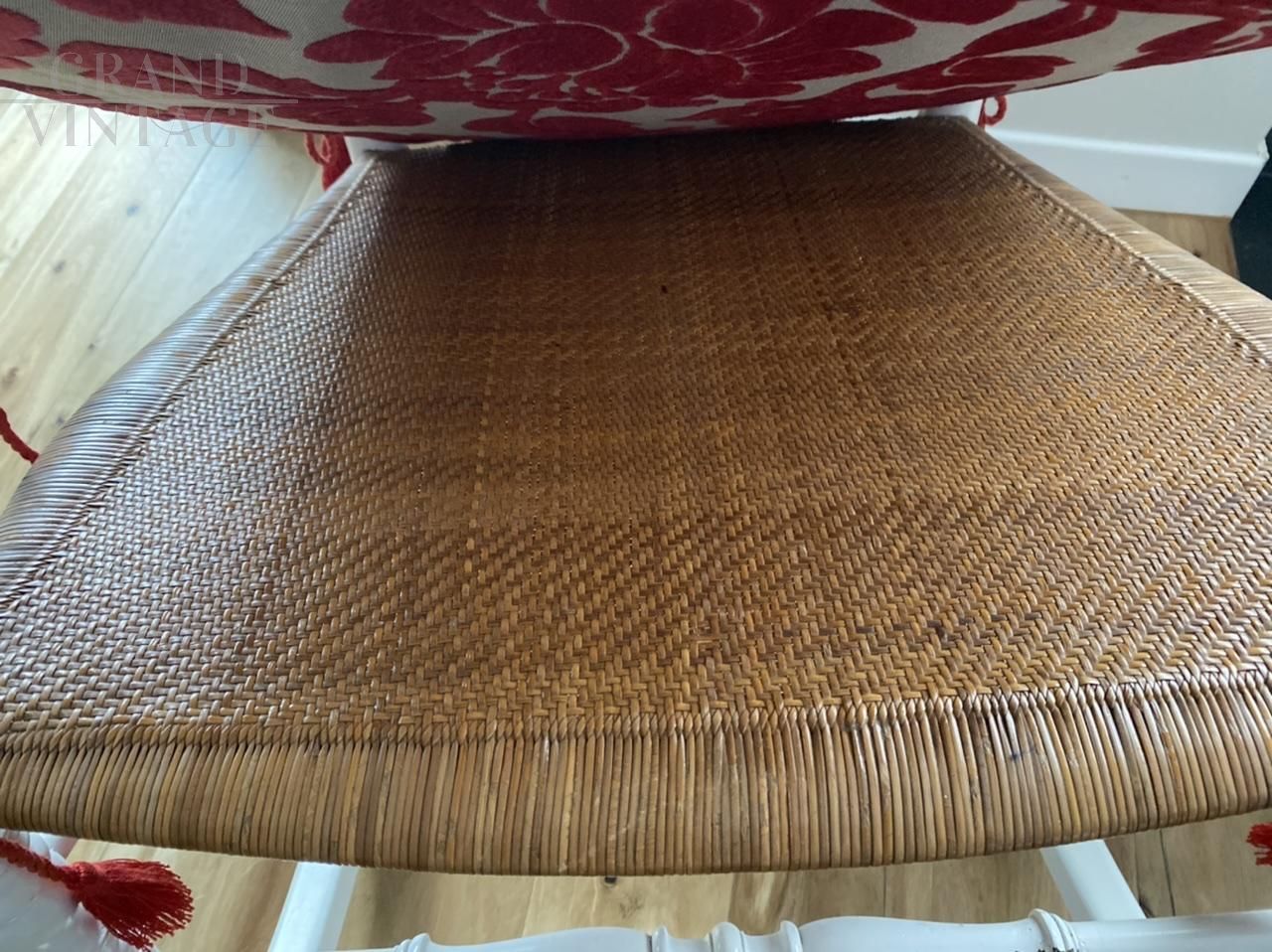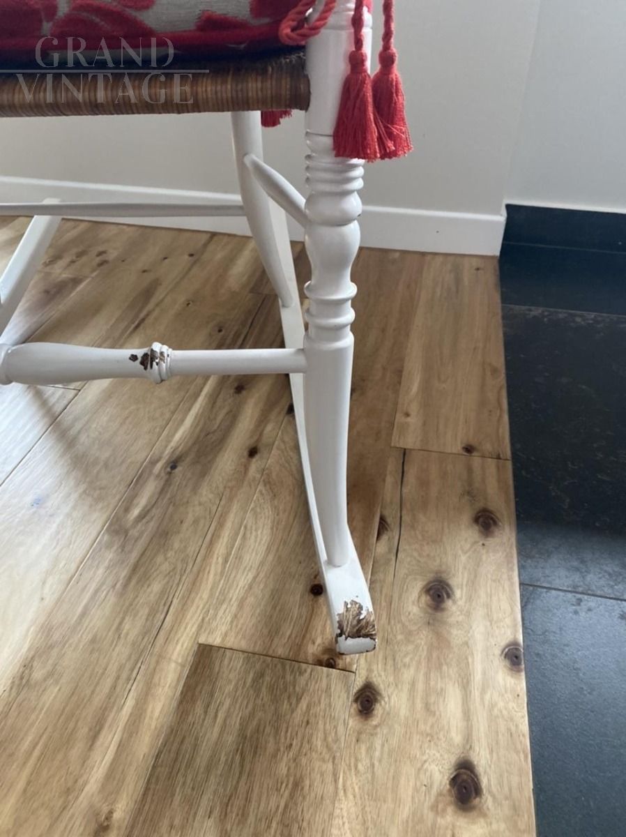 Sedia a dondolo chiavarina, laccata bianca da artigiano di Chiavari, seduta originale in ottime condizioni. Cuscino bianco con fiori in velluto rosso, confezionato su misura.