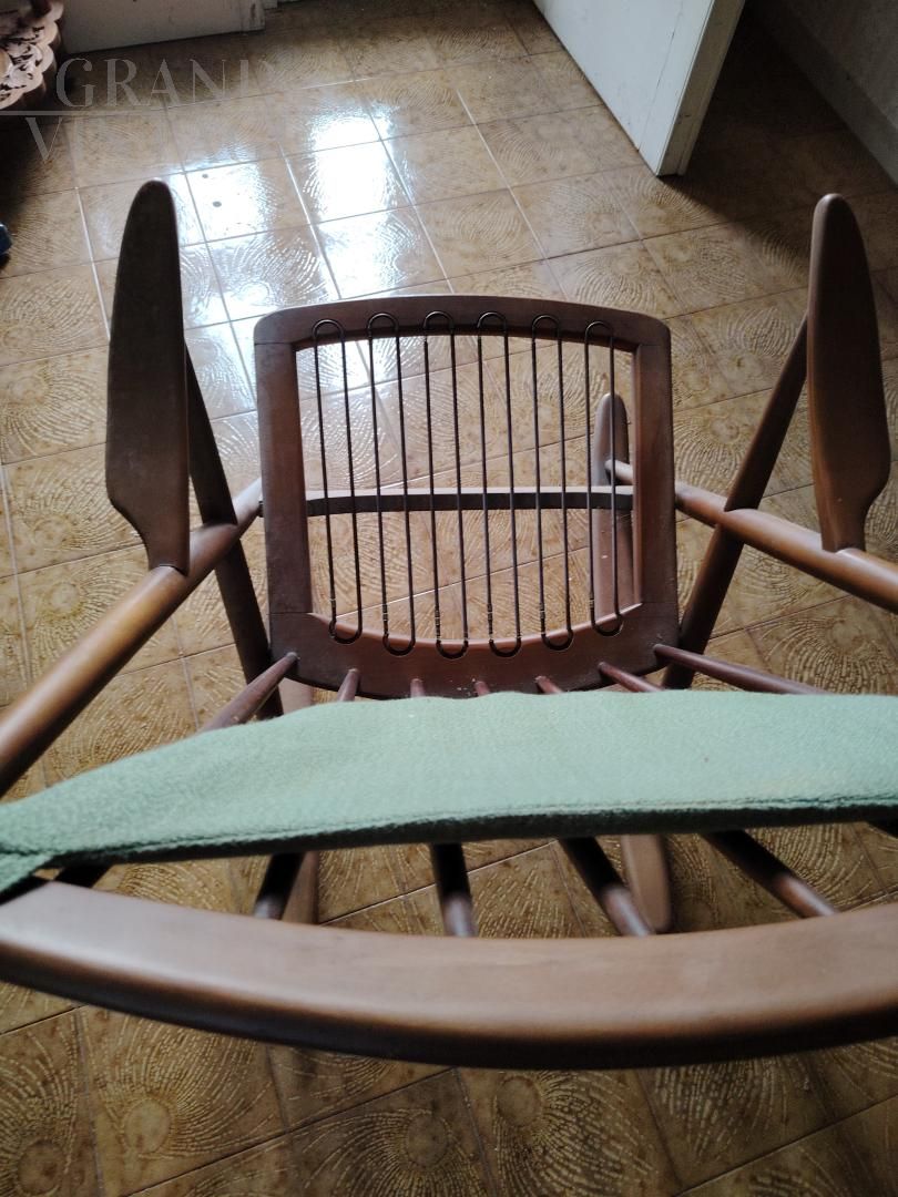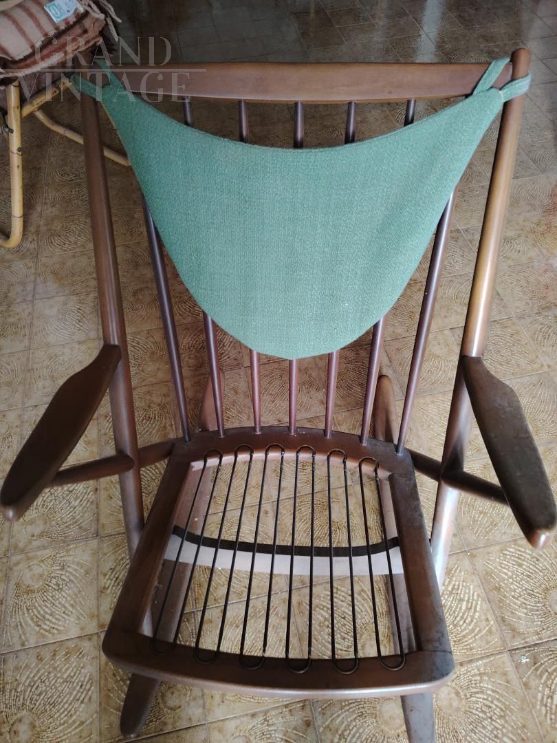 Sedia a dondolo design scandinava di Frank Reenskaug per Bramin, Danimarca anni '60. Lo schienale è rivestito in tessuto verde acqua, il cuscino sulla seduta risulta mancante.