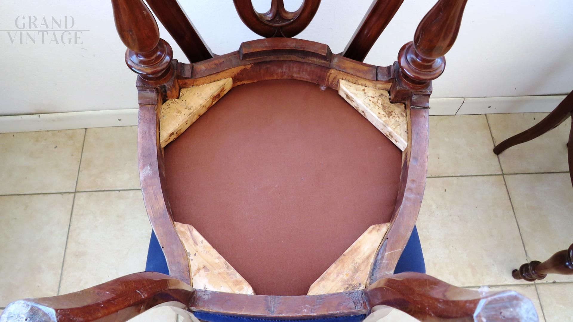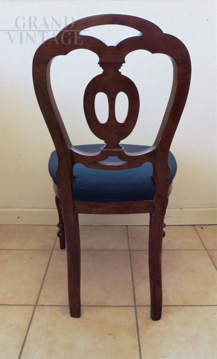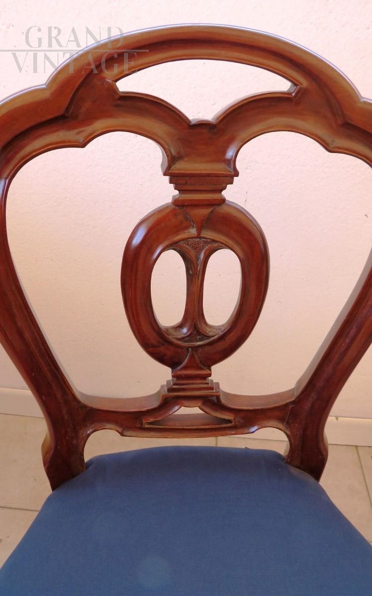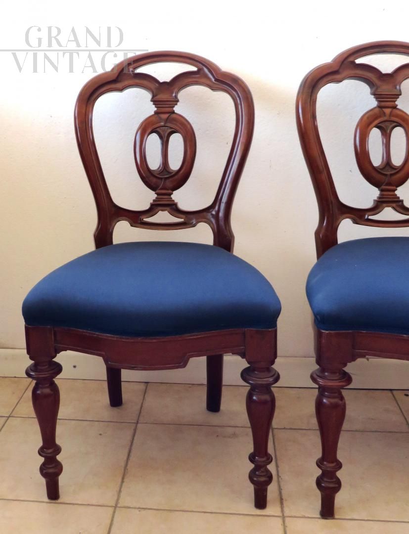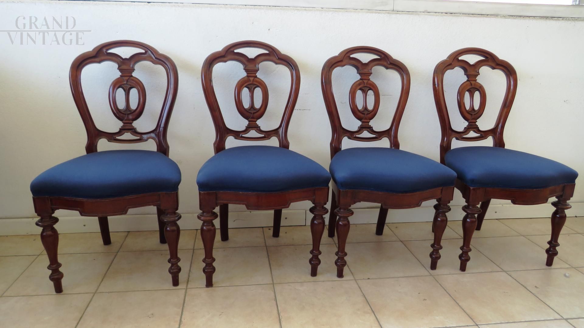 Gruppo di 4 sedie Vittoriane della fine del XIX secolo con schienale leggermente mosso con fregio centrale, imbottite e rifinite in un tessuto blu notte. Queste sedie Vittoriane provengono da un'importante casa milanese, sono state usate fino a pochi giorni fa, si presentano in buone condizioni, sono state sanificate, e presentano i naturali segni del tempo.