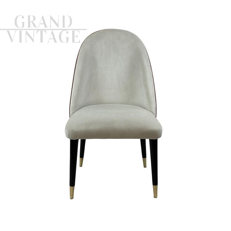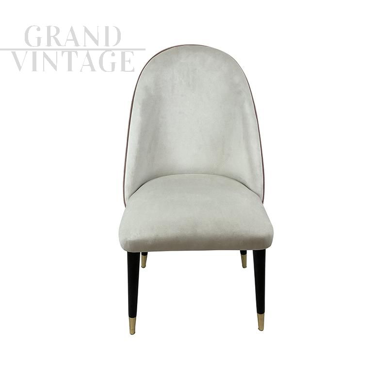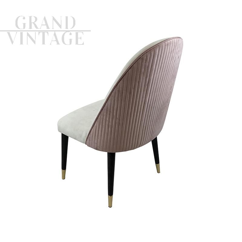 Poltroncina o sedia design capotavola in velluto rosa tenue e bianco, con piedi in legno laccato nero e finale in ottone. Disponibili diversi pezzi.