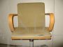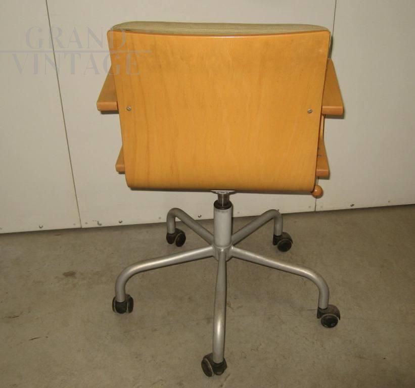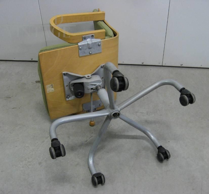 La sedia è in multistrato di faggio, piede in metallo con rotelle. Sotto alla seduta meccanismo che regola l’altezza, non perfettamente funzionante. Il cuscino è attaccato con velcro.