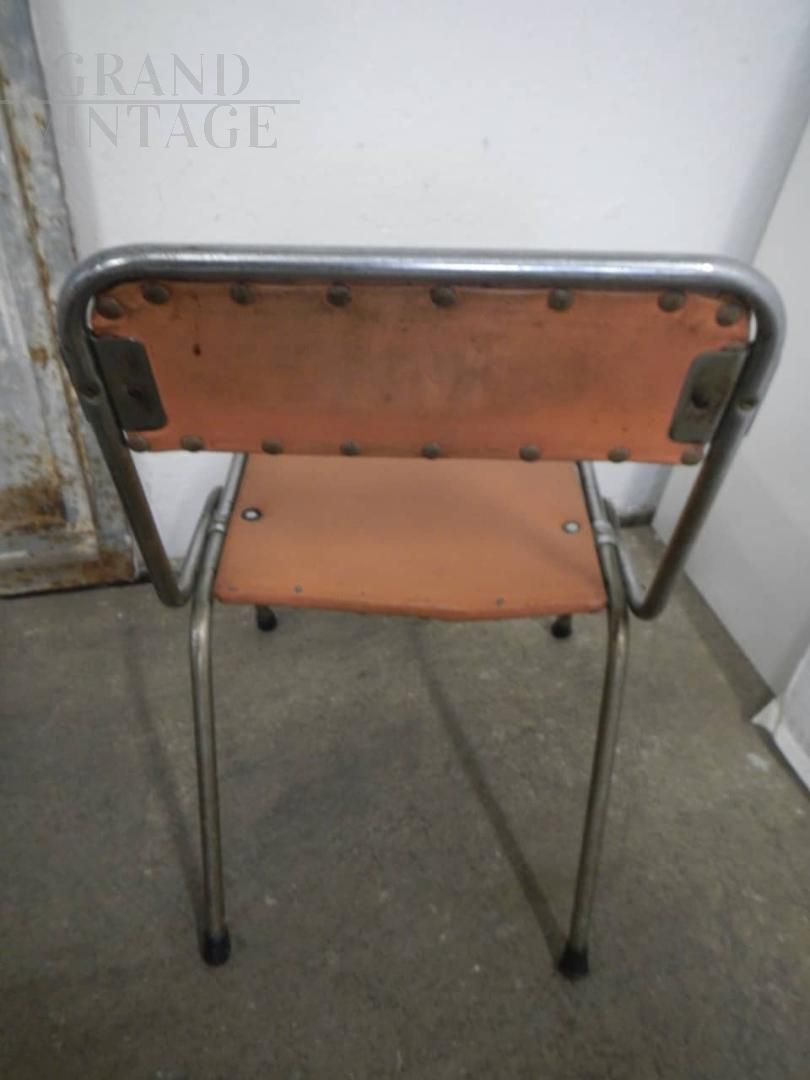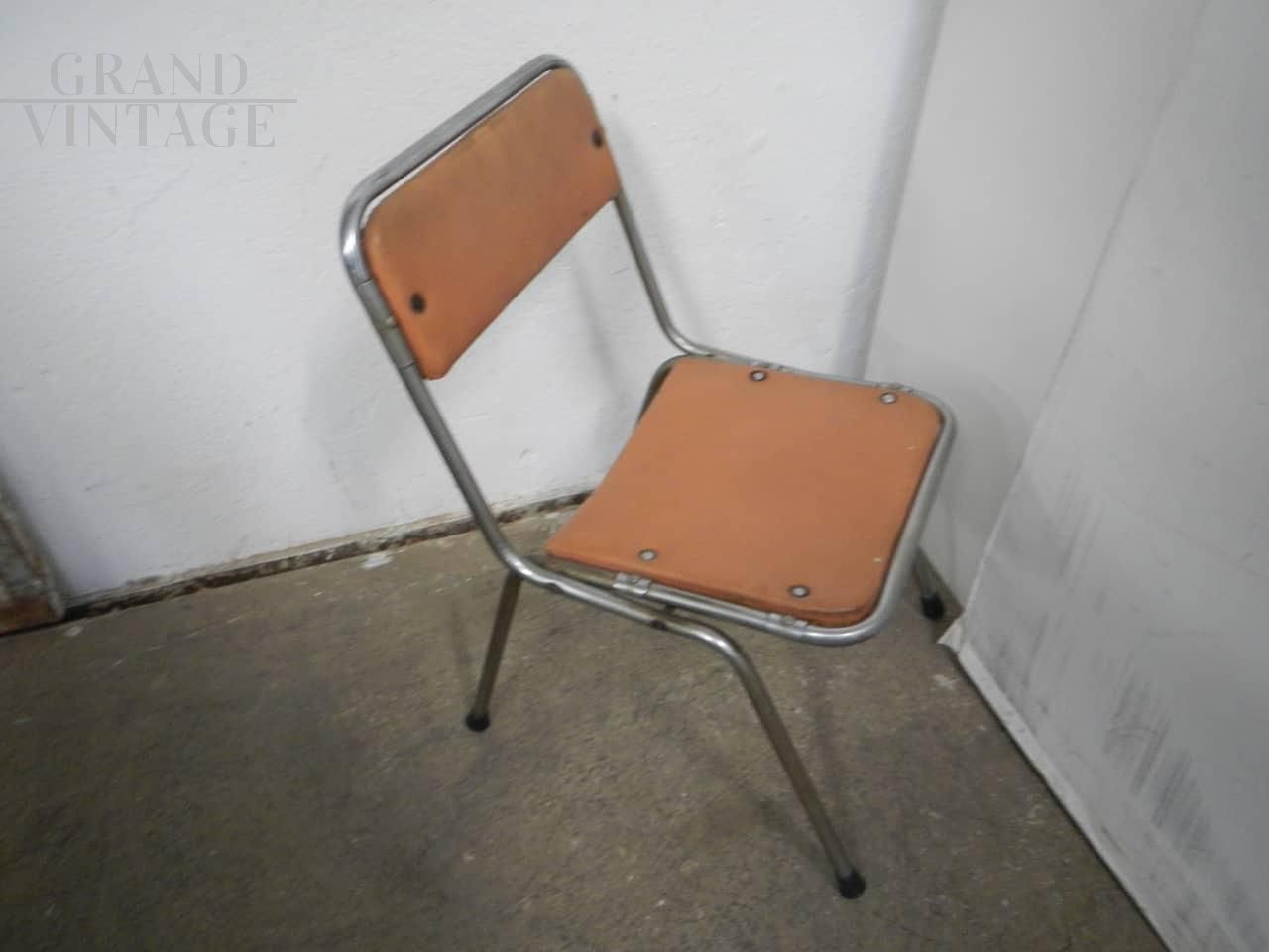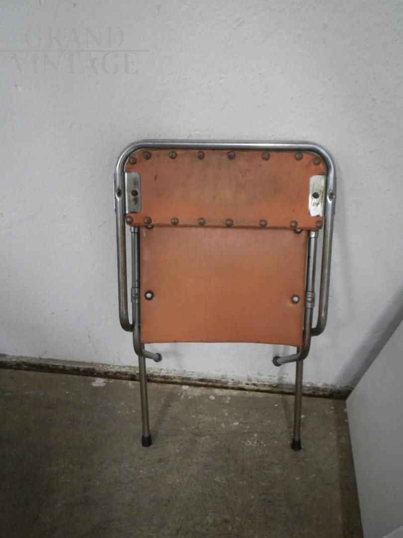 Sedia da bambino pieghevole vintage in metallo e similpelle, struttura buona con naturali segni d’uso. La seduta misura 27 cm.