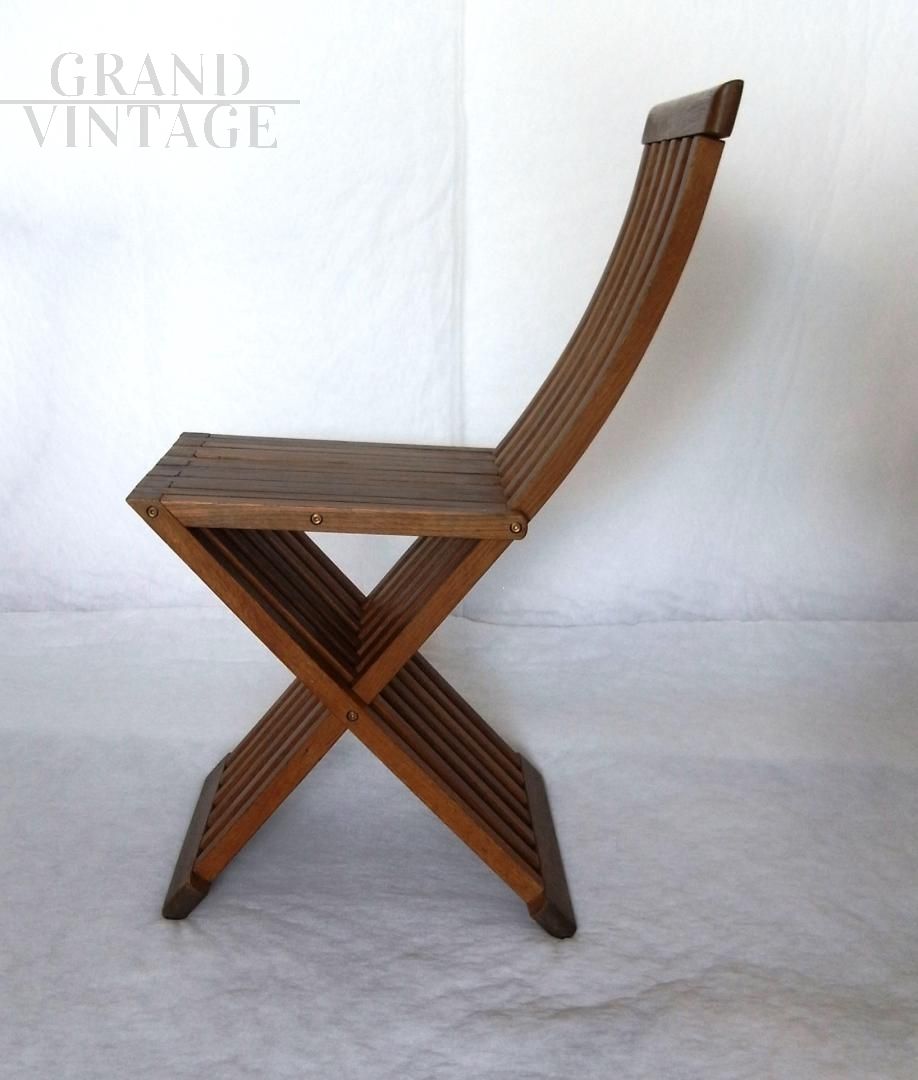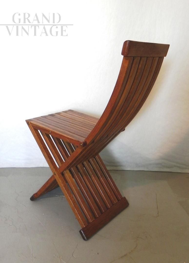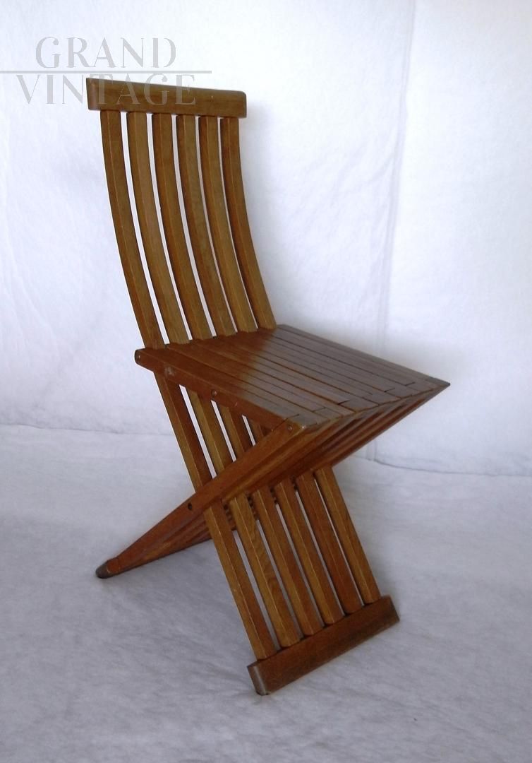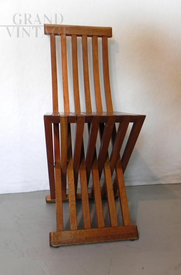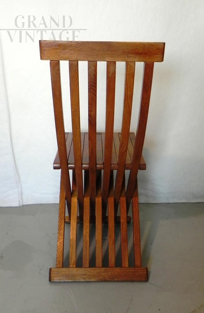 Sedia pieghevole Tomasa di Simon Gavina, disegnata da anonimo in omaggio a Paolo Uccello, design italiano anni '80. Tomasa è una sedia pieghevole con schienale e seduta in listelli di rovere massello curvato con finitura a cera. Gli elementi sono collegati tramite barre e inserti terminali filettati in ottone. La sedia è originale, è stata acquistata nel negozio Simon di Bologna negli anni '80. E' presente la fattura del 1986 a testimonianza.