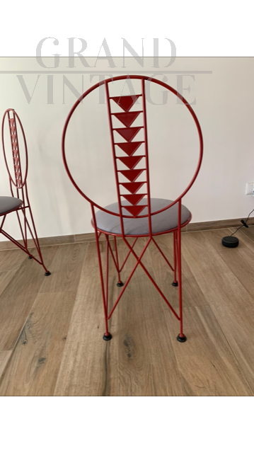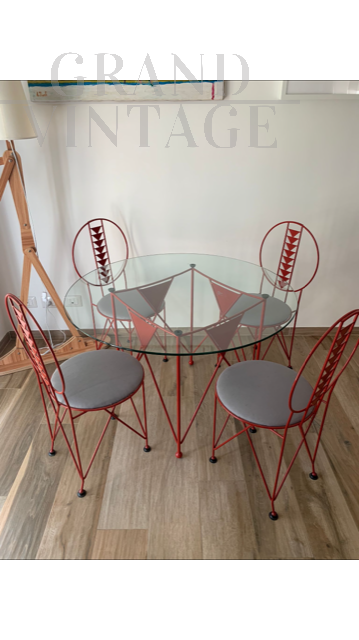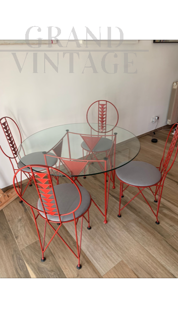 Set da salotto Midway di Frank Lioyd Wright per Cassina composto da quattro sedie con struttura in metallo laccato rosso e tavolo con piano in cristallo, alto design anni '70, pezzi Unici originali, con marchio ben visibile. Il set si trova in buono stato di conservazione.