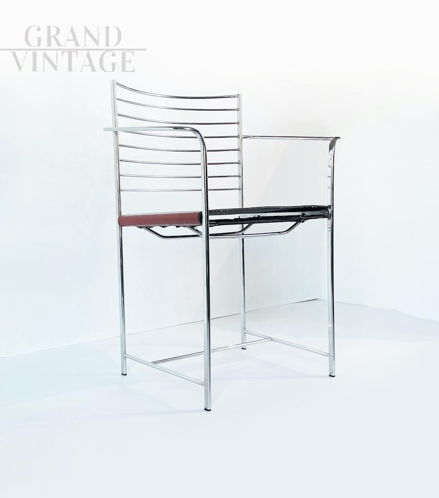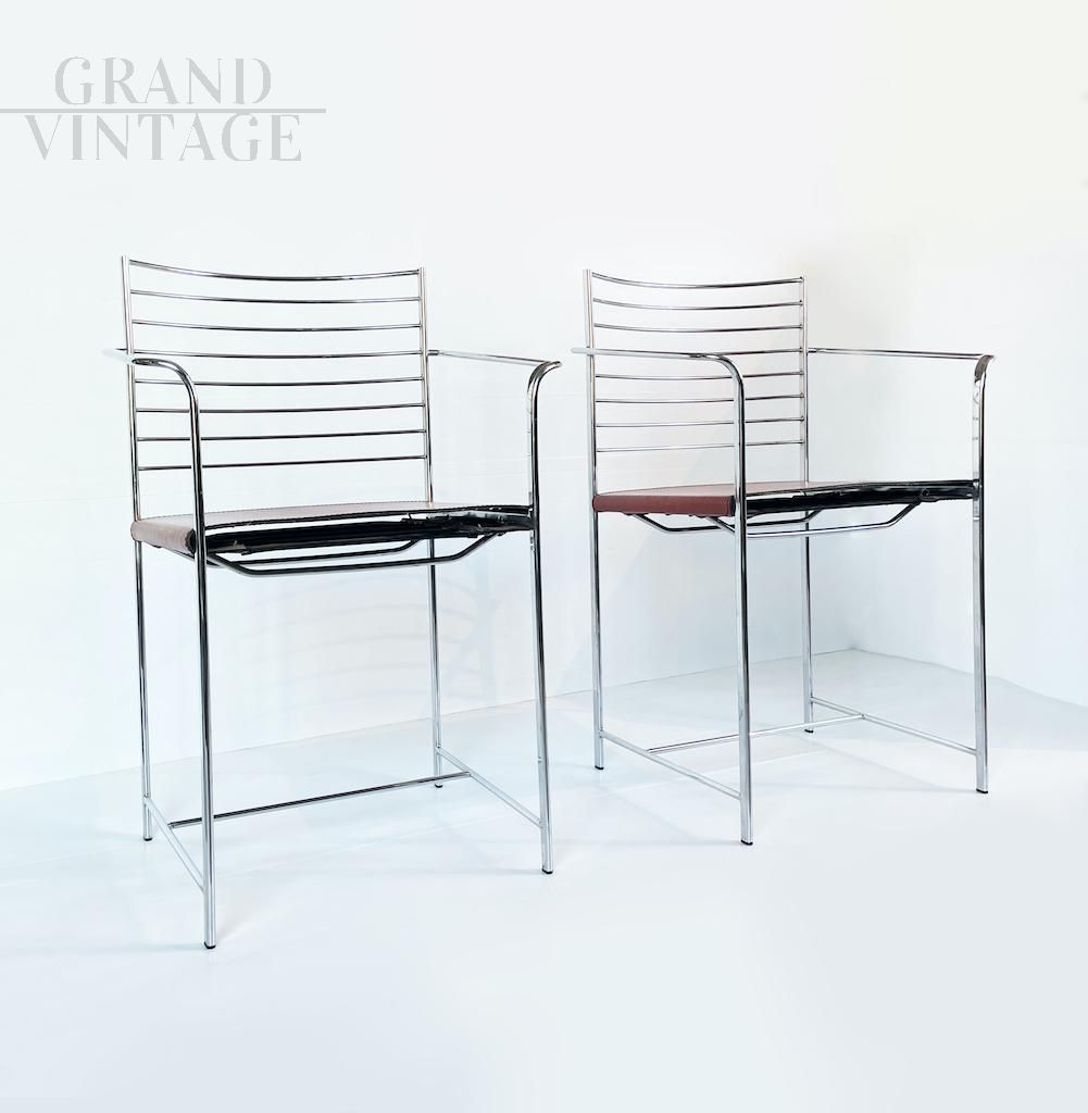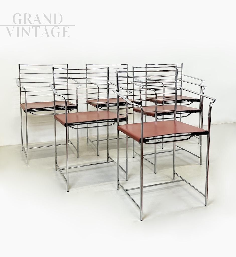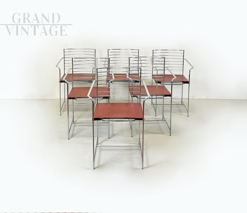 Iconiche sedie da pranzo Mid Century realizzate da Cidue Italy con seduta in cuoio rosso - arancio e struttura in acciaio cromato, emblematiche del gusto minimalista Italiano tra gli anni '70 e '80. Disponibili 6 pezzi, il prezzo si intende cadauna. Si raccomanda l'acquisto in coppie oppure il set intero.