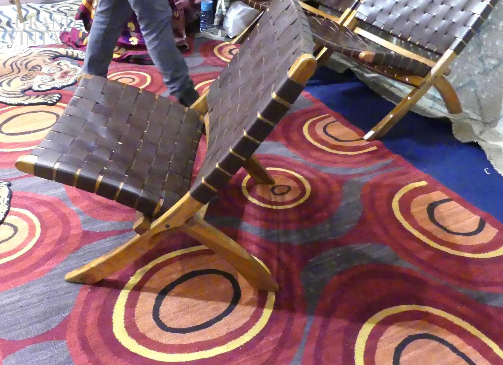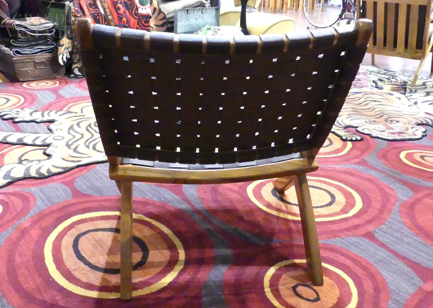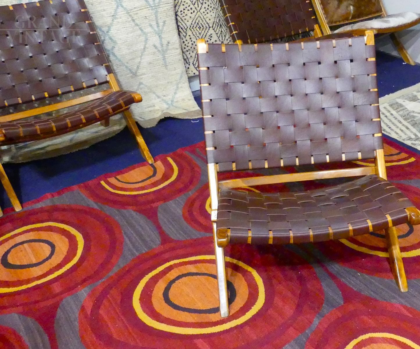 Sedie poltroncine pieghevoli in vero cuoio intrecciato su struttura in legno teak.