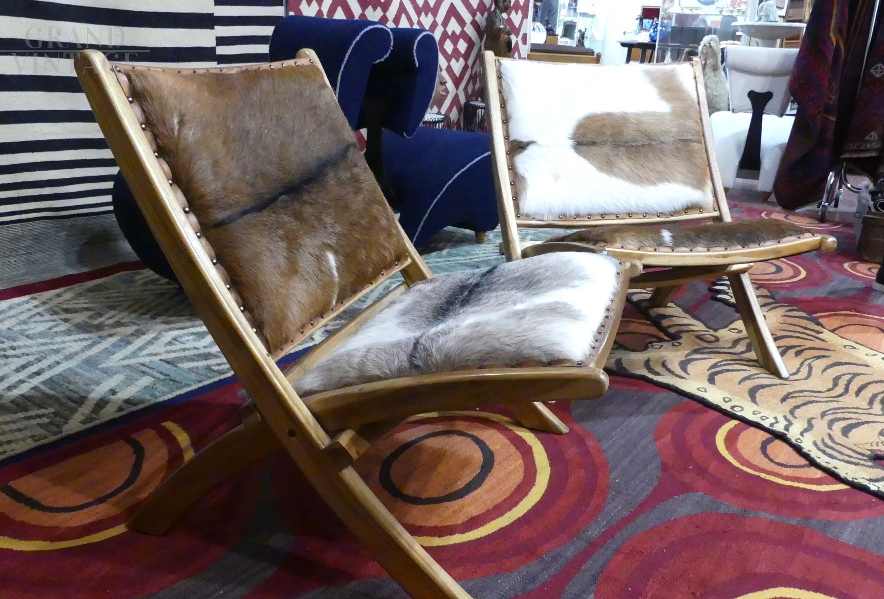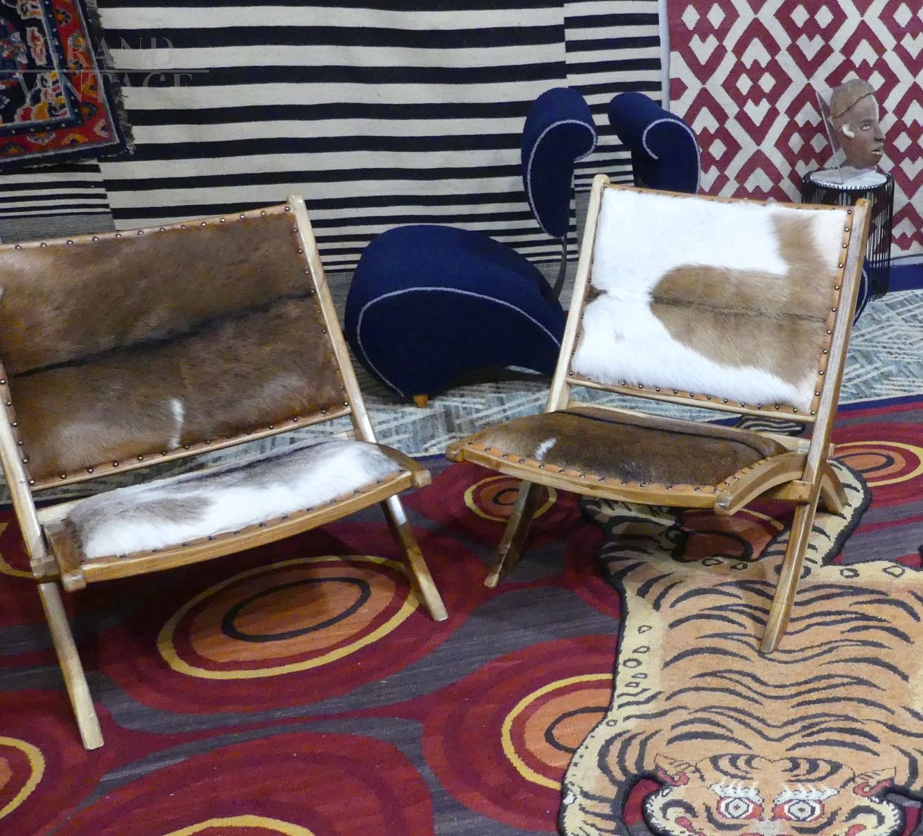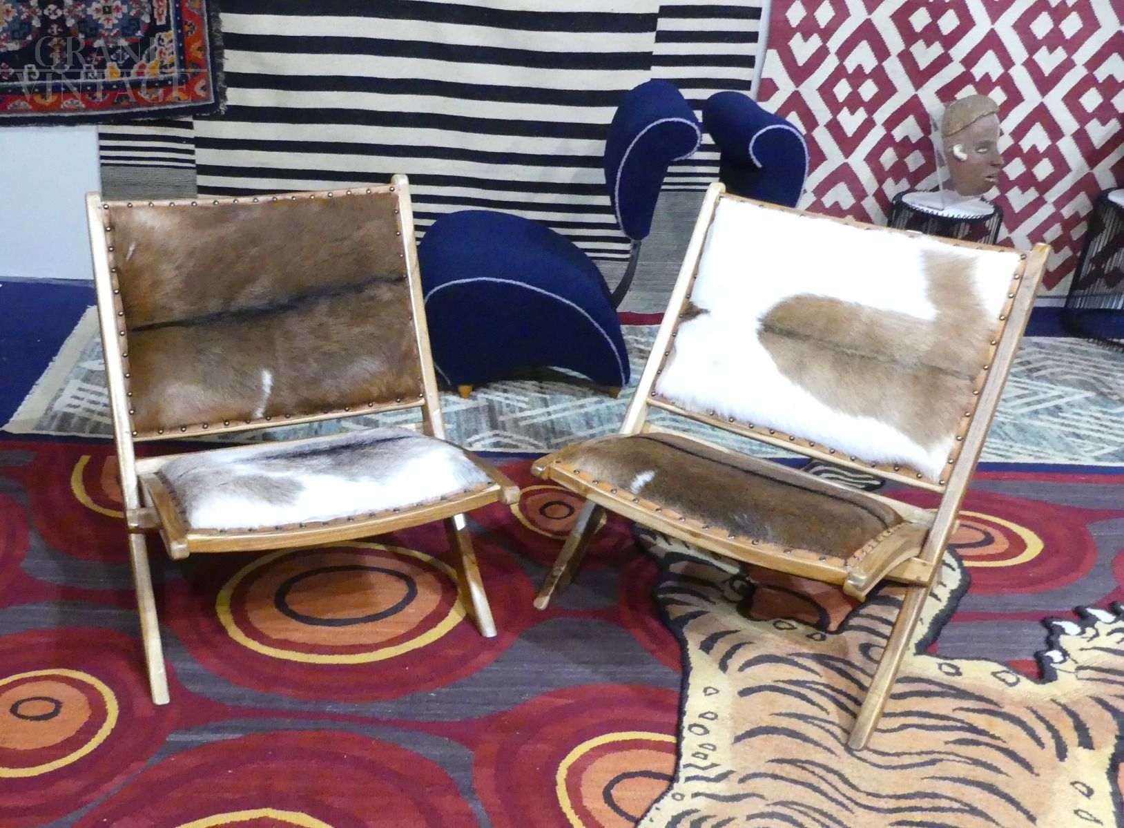 Sedie poltroncine pieghevoli in vera pelle di mucca su struttura in legno teak.