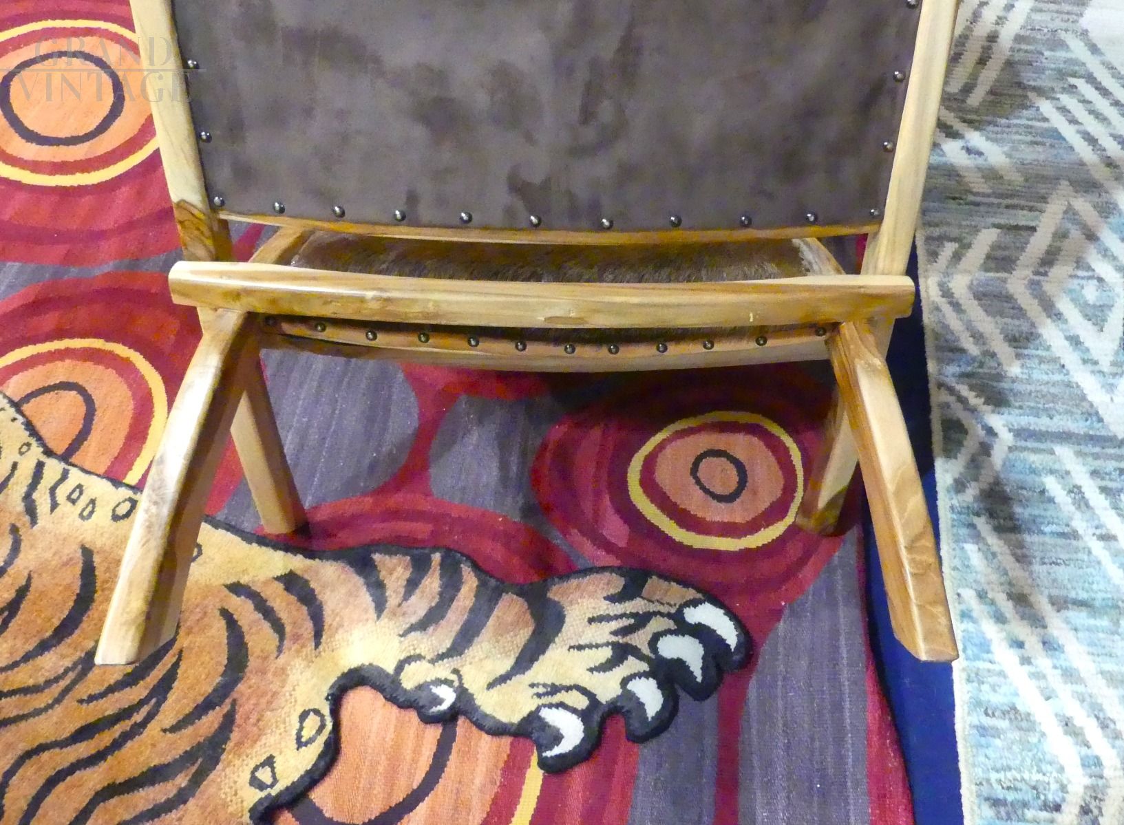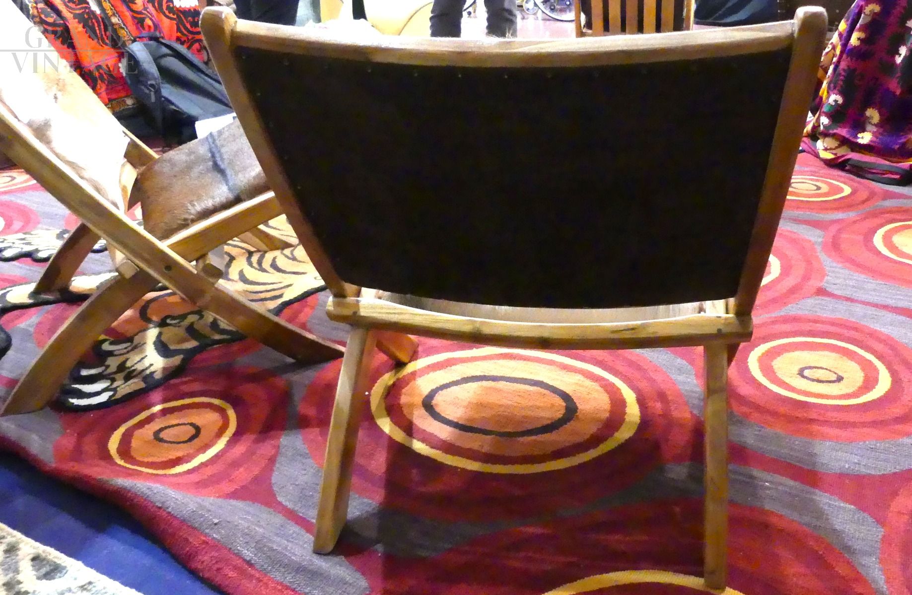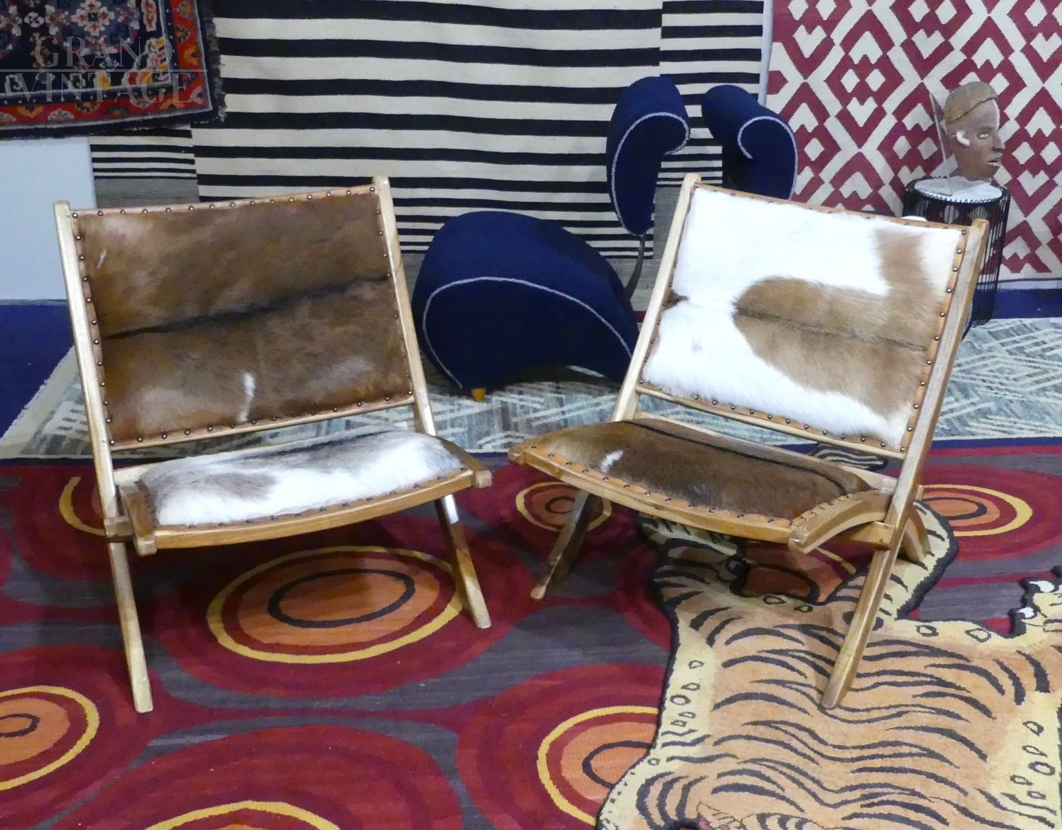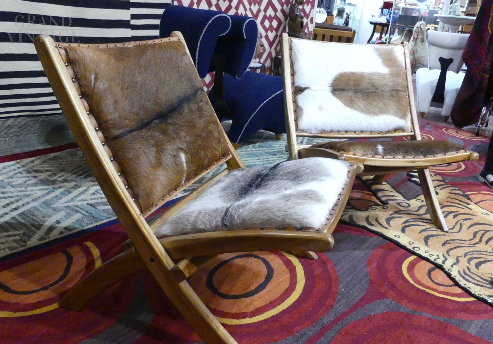 Sedie poltroncine pieghevoli in vera pelle di mucca su struttura in legno teak.