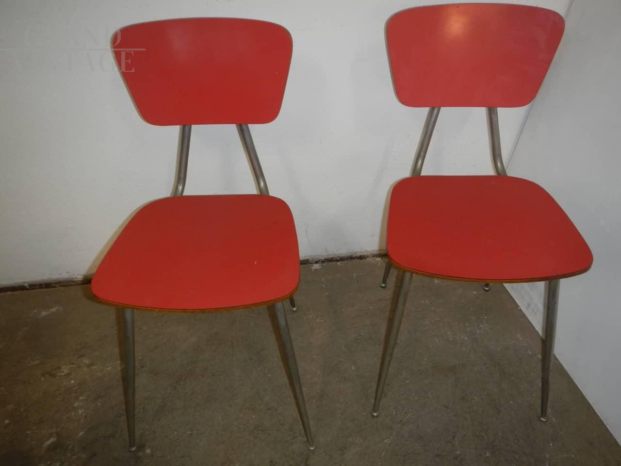Set composto da 4 sedie vintage da cucina rosse in formica. Le sedie hanno struttura in ferro zincato con il classico piede rotondo e sedute in legno compresso rivestito di formica.