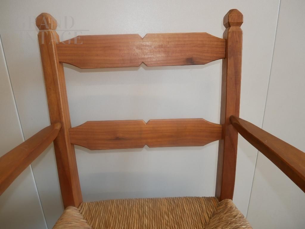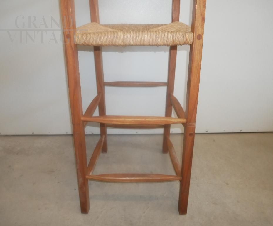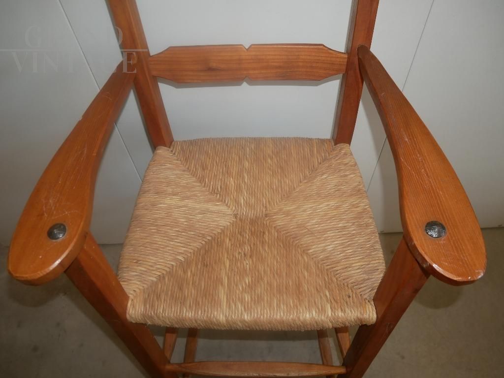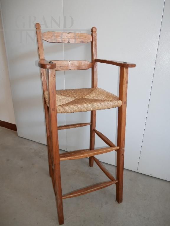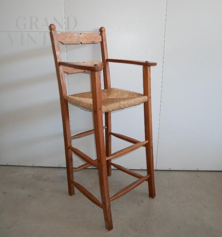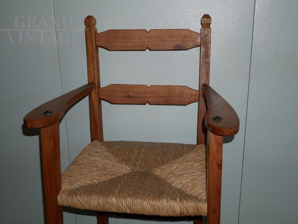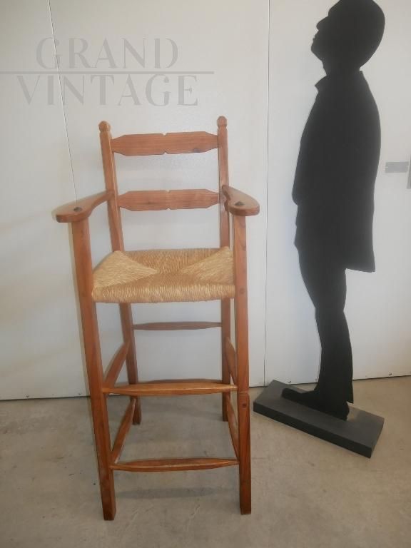 Grande seggiolone vintage alto con seduta in paglia, eseguito interamente a mano, con struttura in legno di frutto a massello e seduta impagliata. In ottimo stato, adoperato pochissimo.