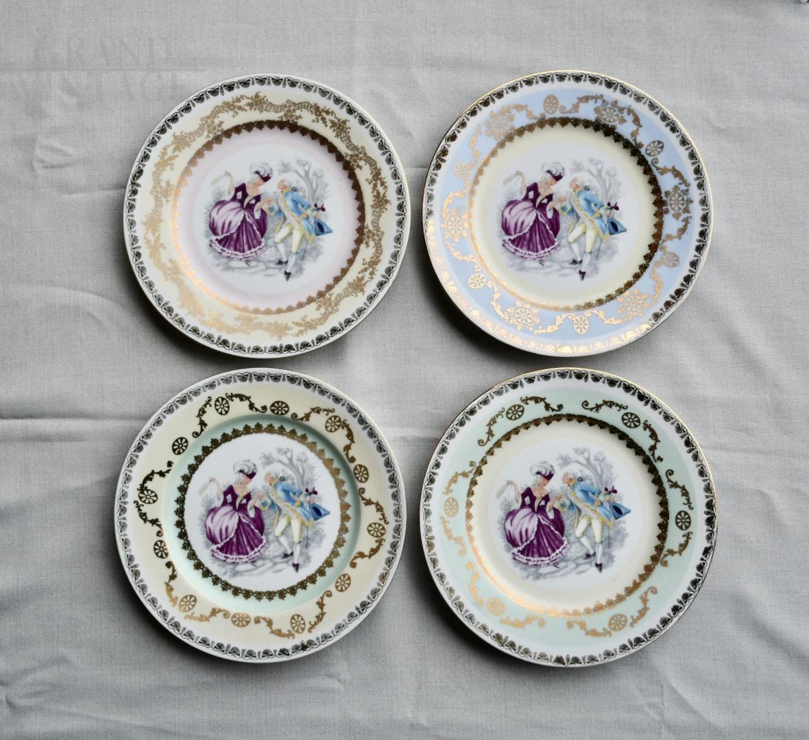 Serie di Quattro piatti di Limonges in porcellana, sono in perfette condizioni e portano un decoro che varia uno dall'altro, possono essere utilizzati da appendere come arredo per una parete di casa. Il diametro dei piatti è di cm 26,5.