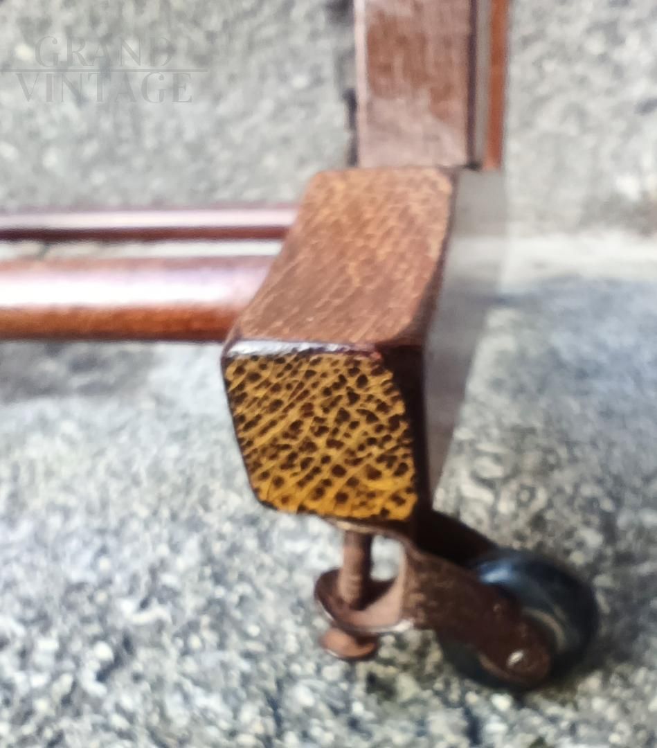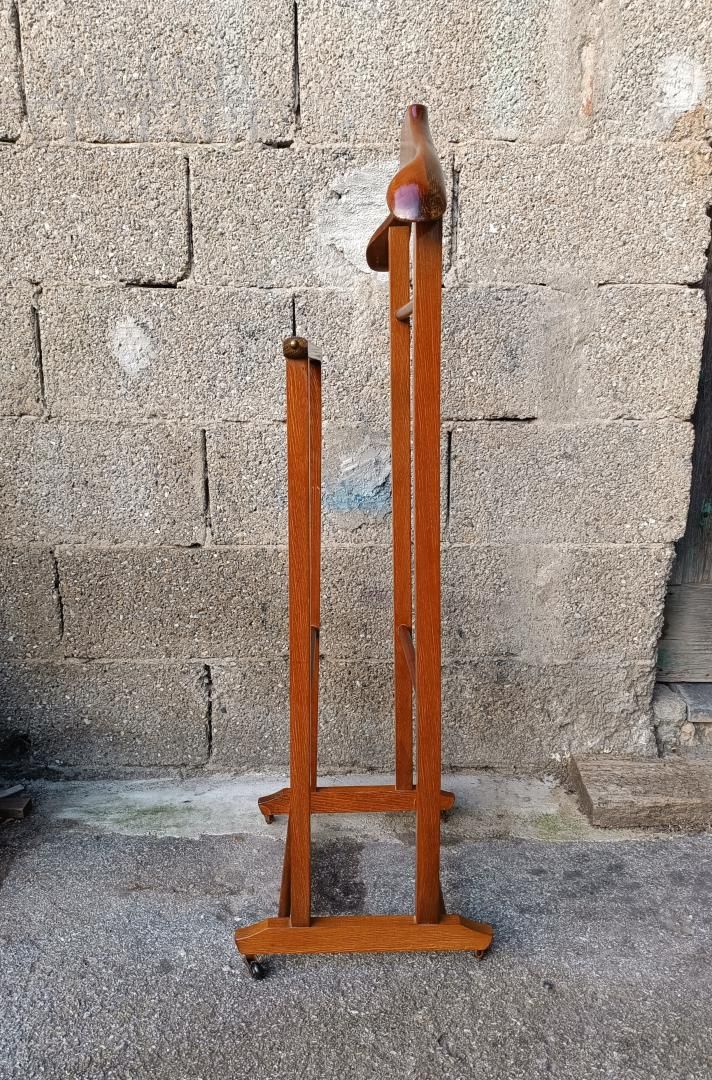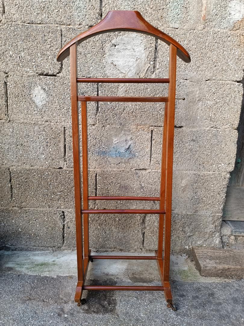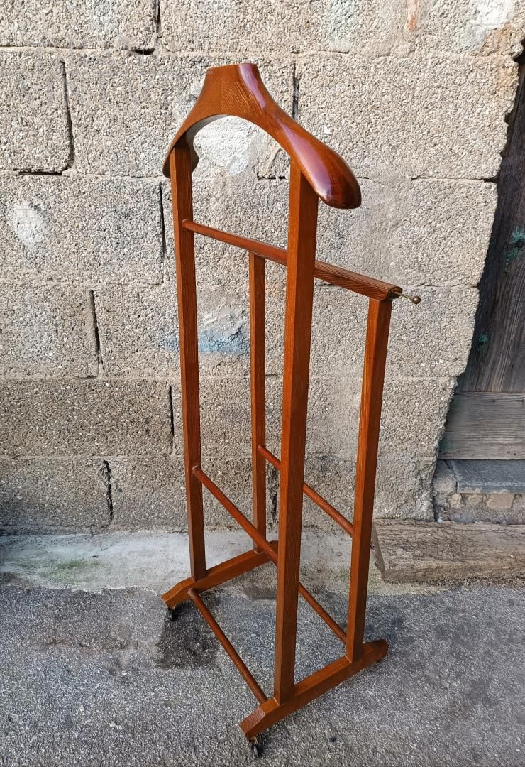 Servomuto dei Fratelli Reguitti in legno di faggio, finitura castagno, con doppia asse verticale per poter appoggiare giacca e pantaloni in 2 stand separati, con alette retraibili in ottone per cravatte ecc. Con 4 ruotine in gomma, per poterlo spostare comodamente. Completamente smontabile grazie a 4 robuste viti poste nella parte sottostante, a 2 supporti in ottone è possibile appoggiare anche le scarpe. Anni '50 in buone condizioni, ma con alcuni segni del tempo. Marchio del produttore presente.