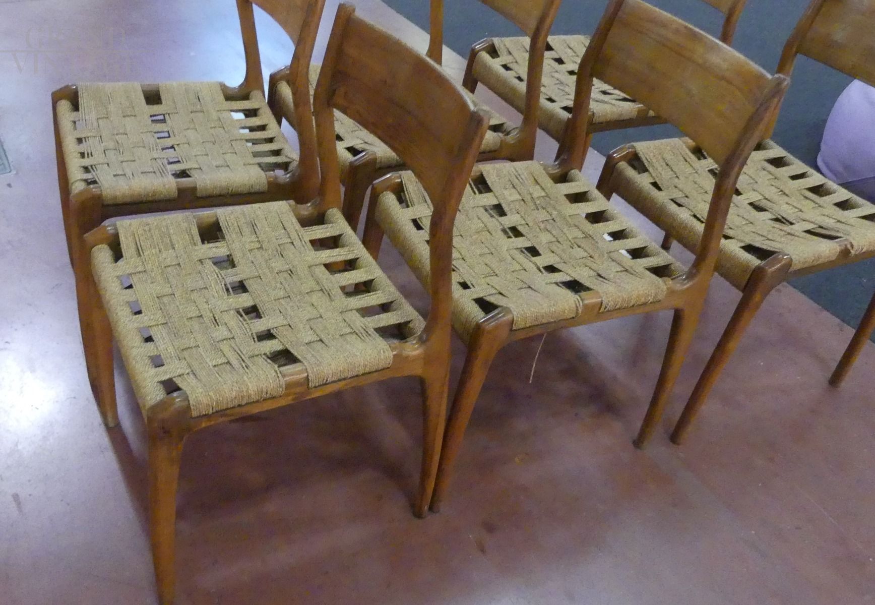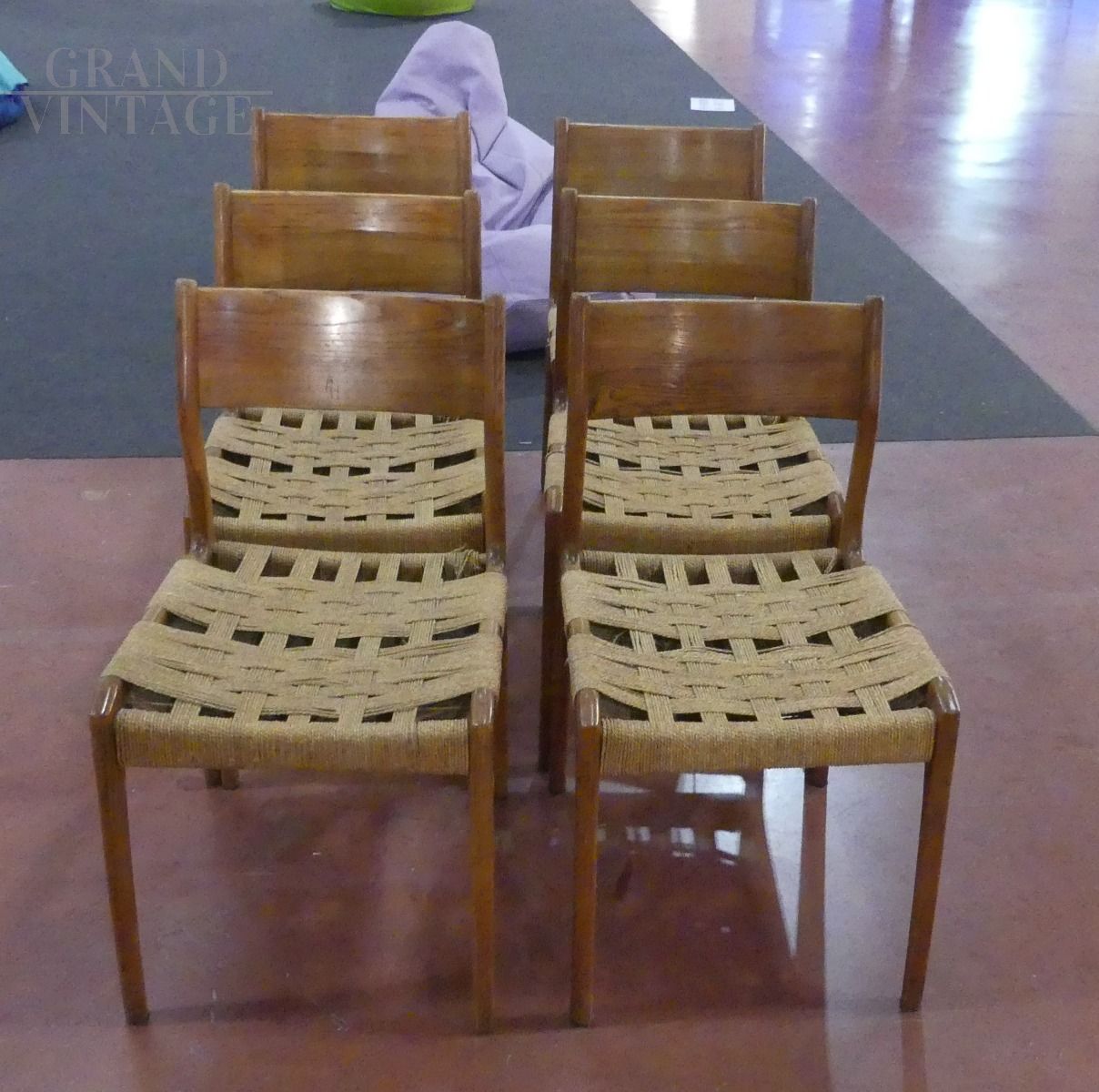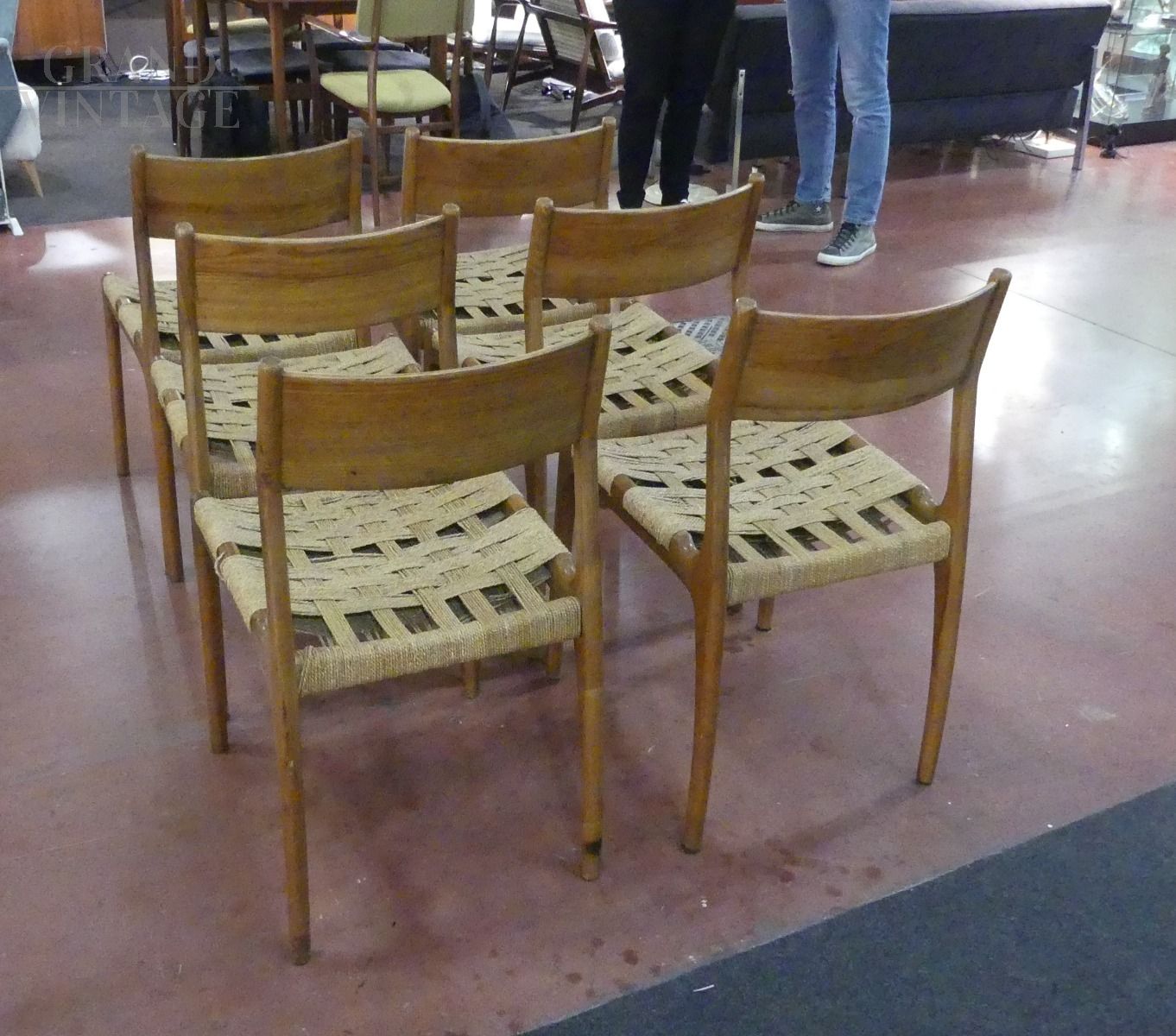 Set di 6 sedie modello 993 di Studio TiPi, designer Werther Toffoloni e Piero Palange, per Fratelli Montina, anni '60. Realizzate in legno di frassino e corda, in ottime condizioni originali.