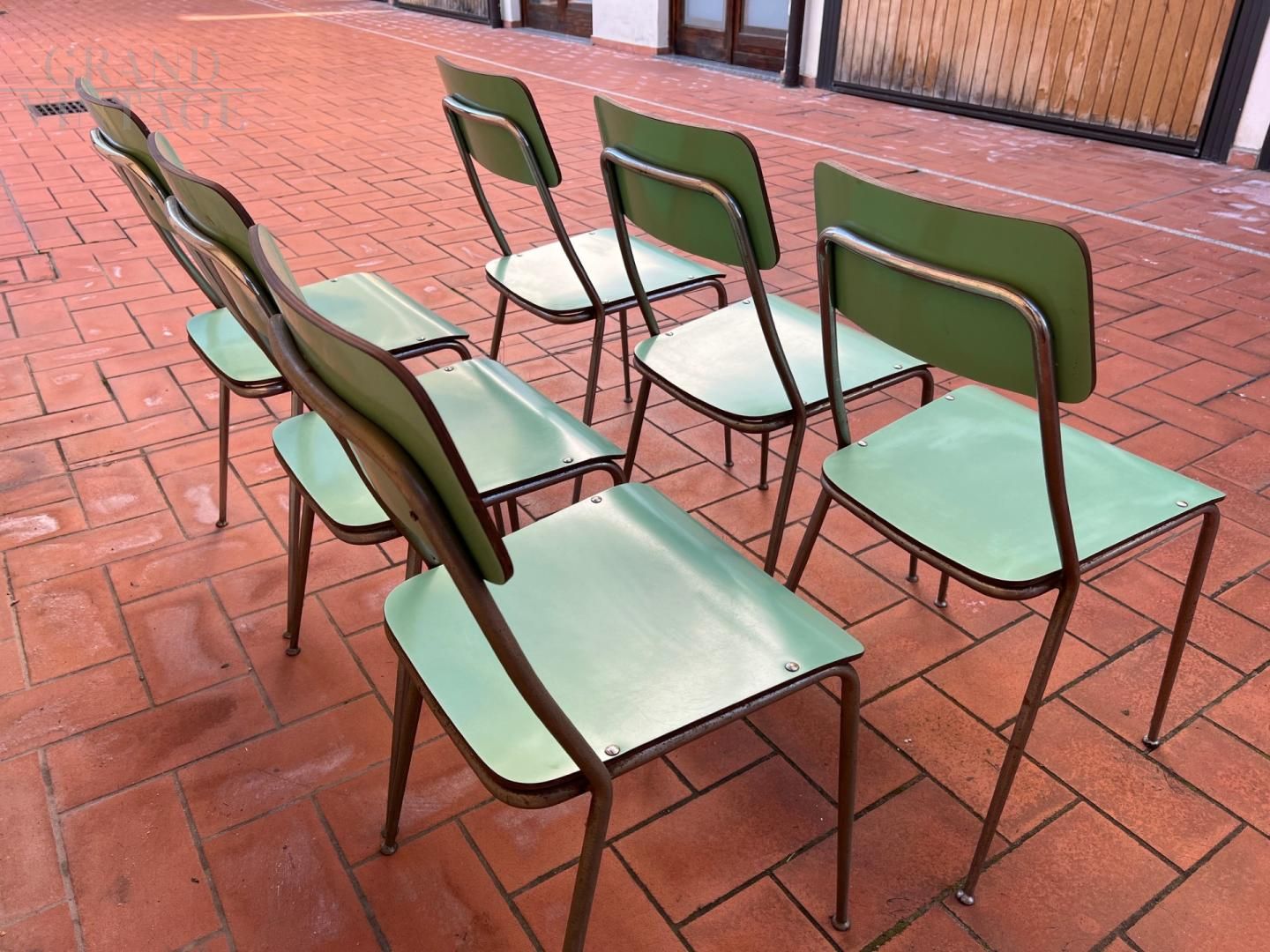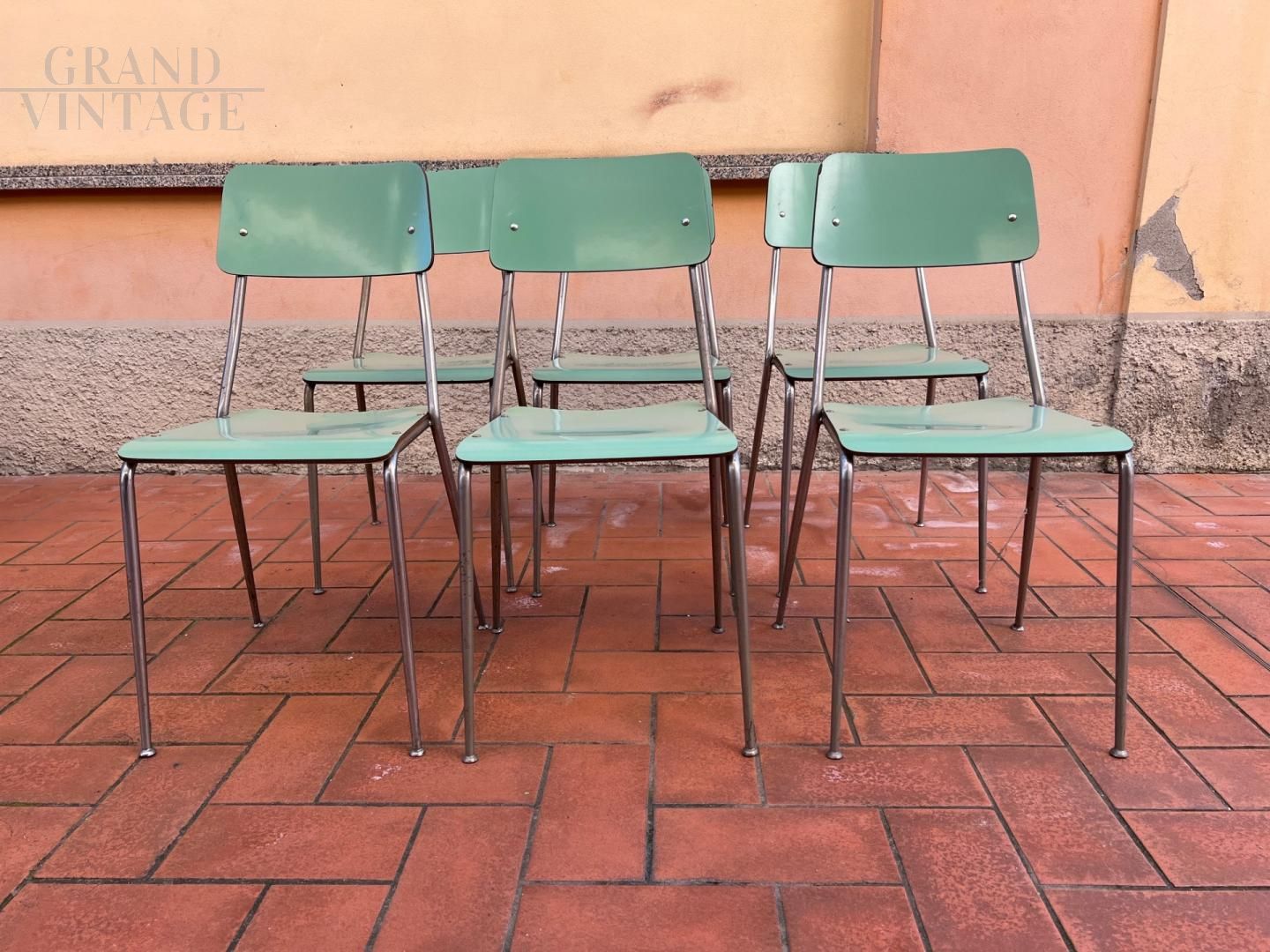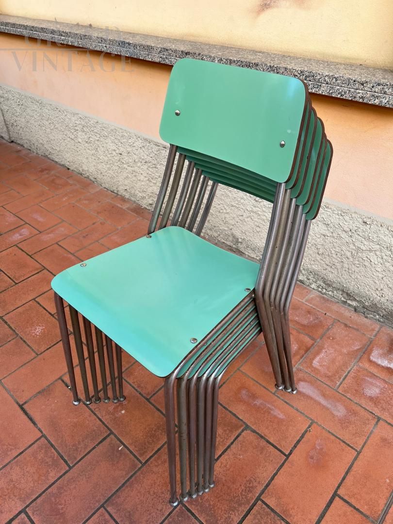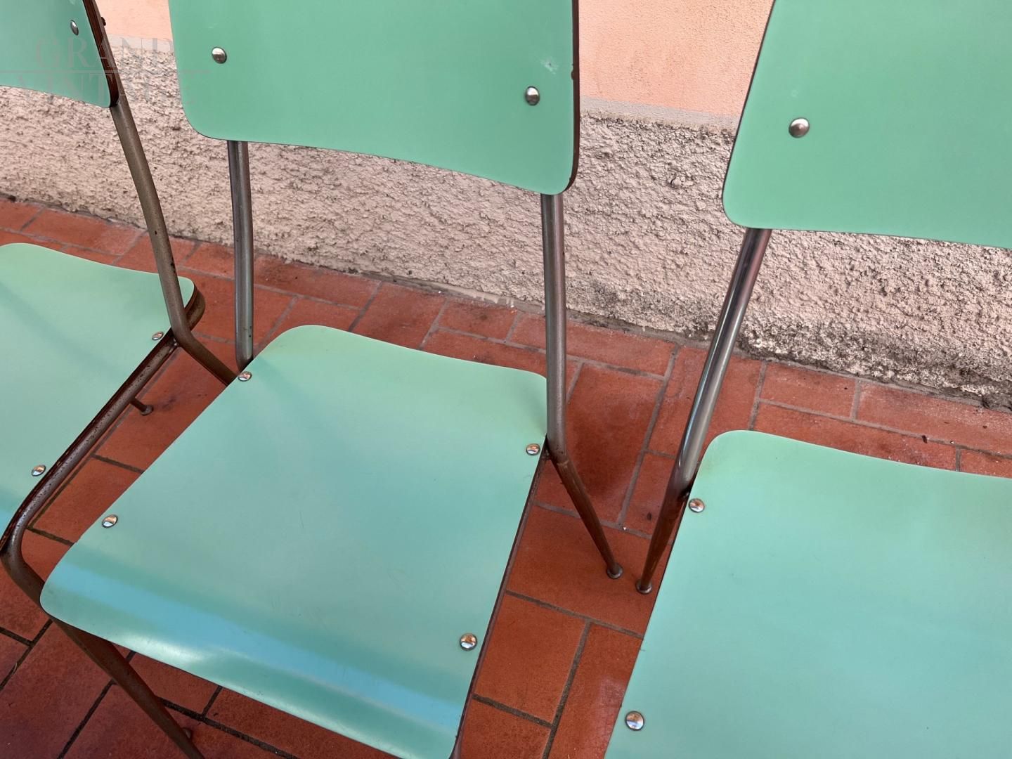 Set composto da 6 sedie vintage in formica verde acqua con struttura in metallo, impilabili e in buone condizioni, con piccoli difetti fisiologici dati dall'età. La seduta è alta 45 cm da terra.