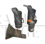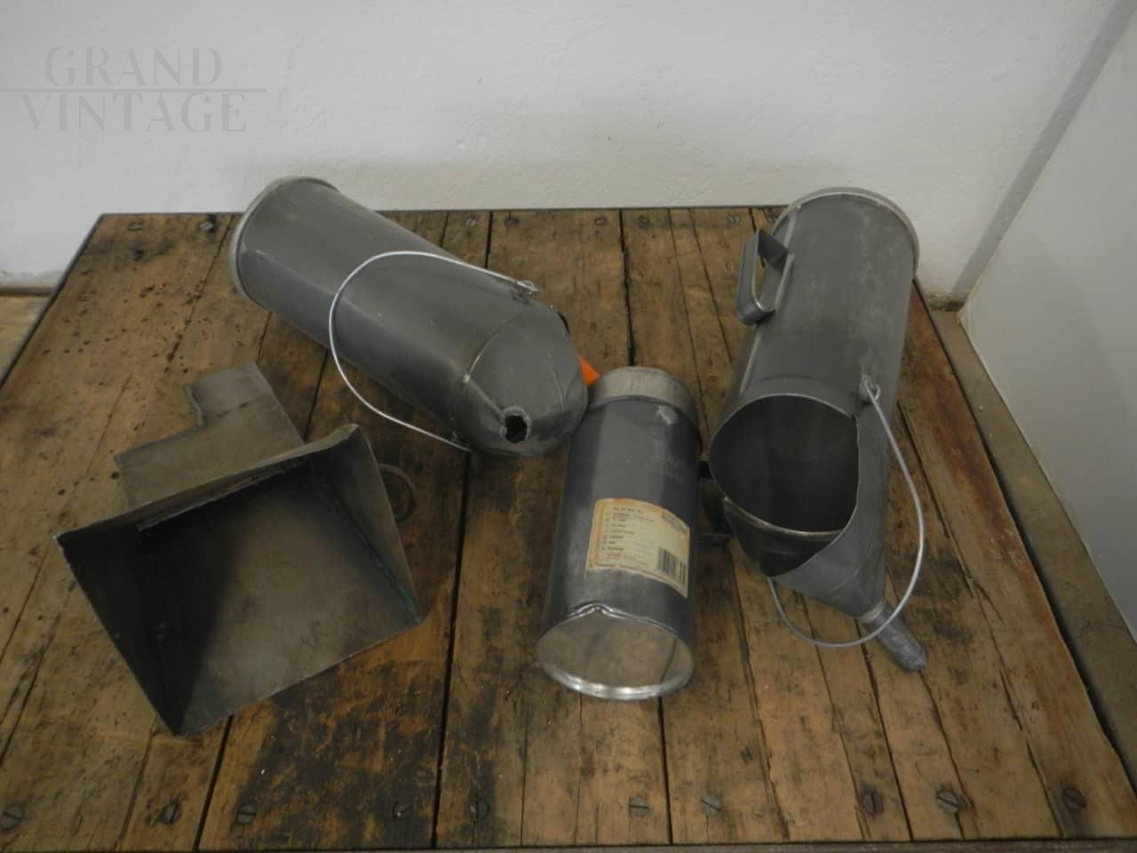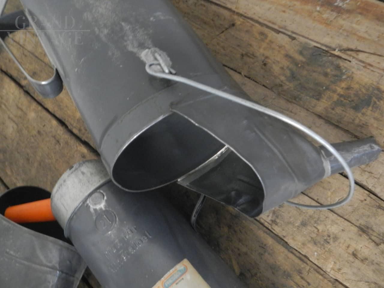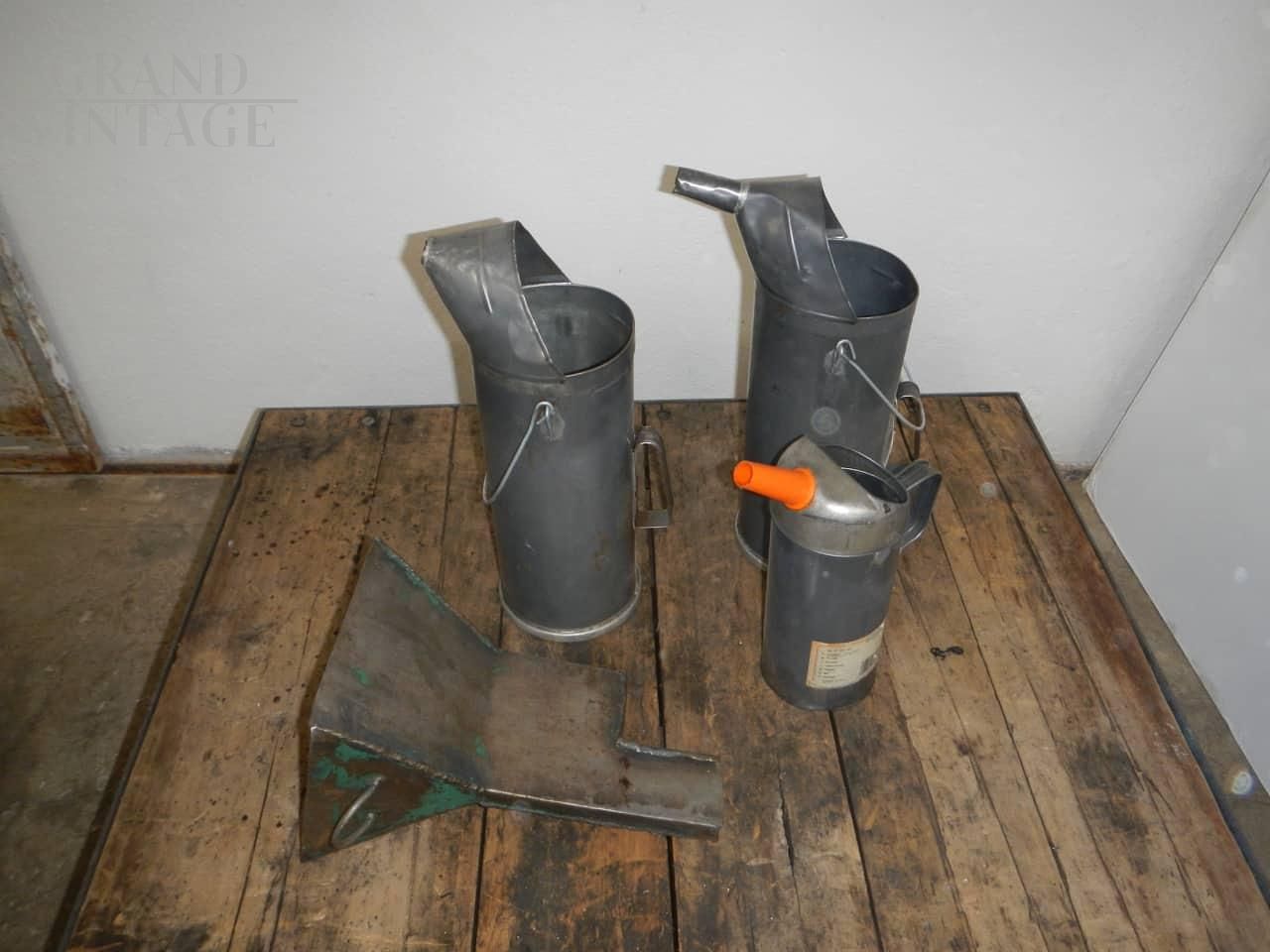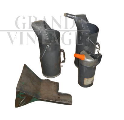 Set di attrezzi da officina meccanica vintage anni '50, composto da un imbuto e 3 barattoli per versare l'olio del motore delle automobili. Per collezionisti.