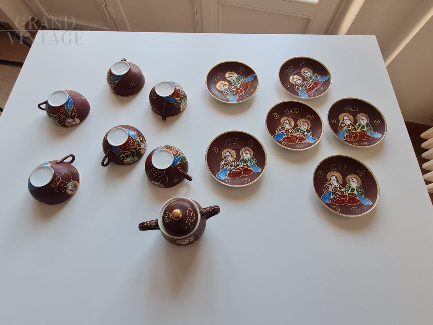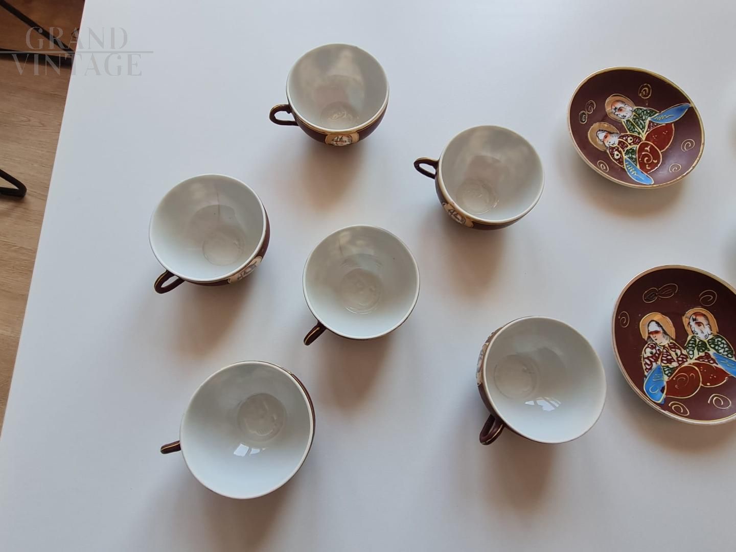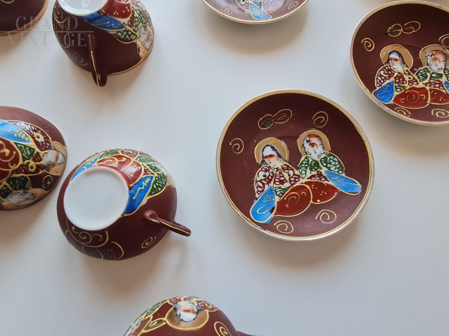Magnifico servizio da caffè vintage giapponese in porcellana degli anni '60 - '70, con guscio d'uovo, dipinto a mano con figure giapponesi e con litofania. Il set è composto da 6 tazzine + 6 piattini + zuccheriera.