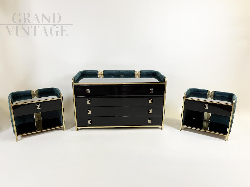 Set comò e comodini vintage anni '70 in velluto verde ottanio e vetro nero