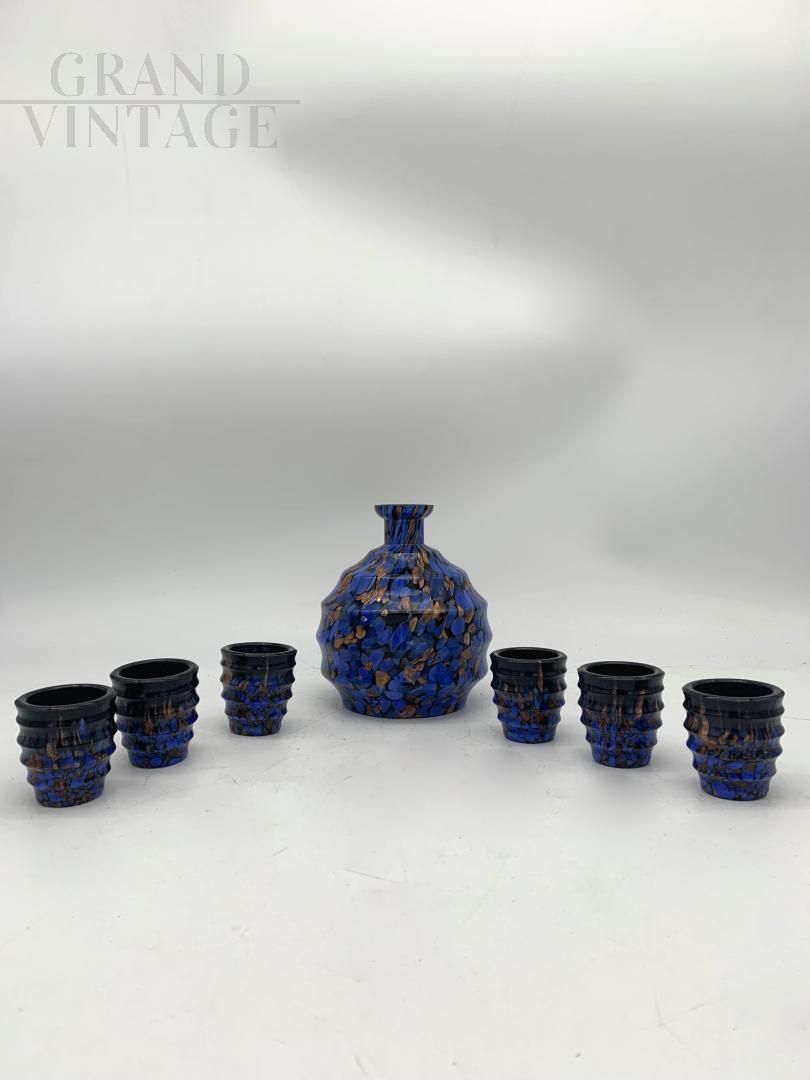 Bellissimo set da caffè in vetro di Murano attribuito alla ditta Toso, Italia anni '30, composto da una bottiglia - caraffa e sei tazzine, tutti in vetro artistico lavorato nei colori blu, oro e nero, con eleganti forme mosse. La pasta in vetro è di buona consistenza e non presenta crepe. Il set è stato fatto a mano, bello, elegante e raro.