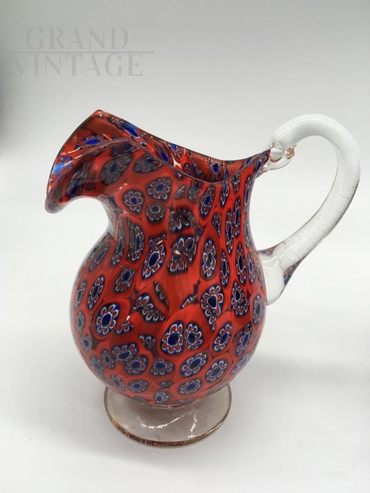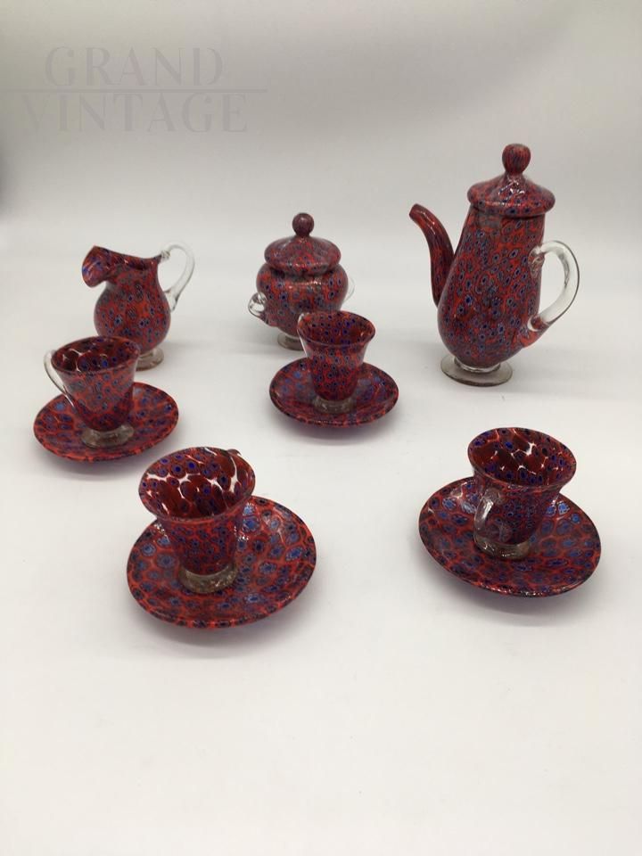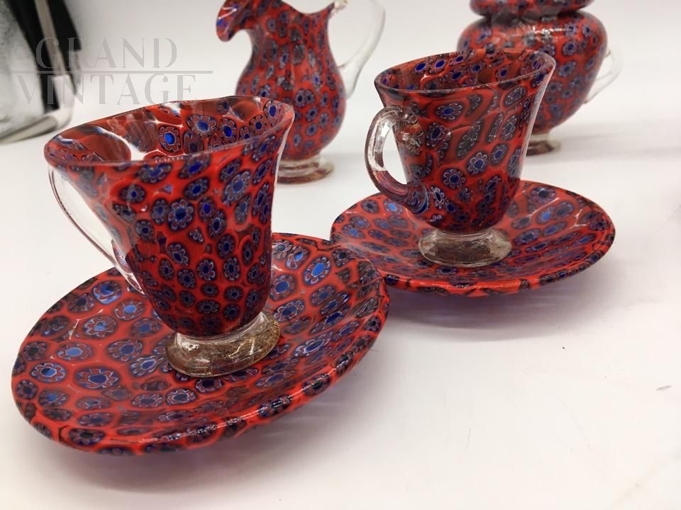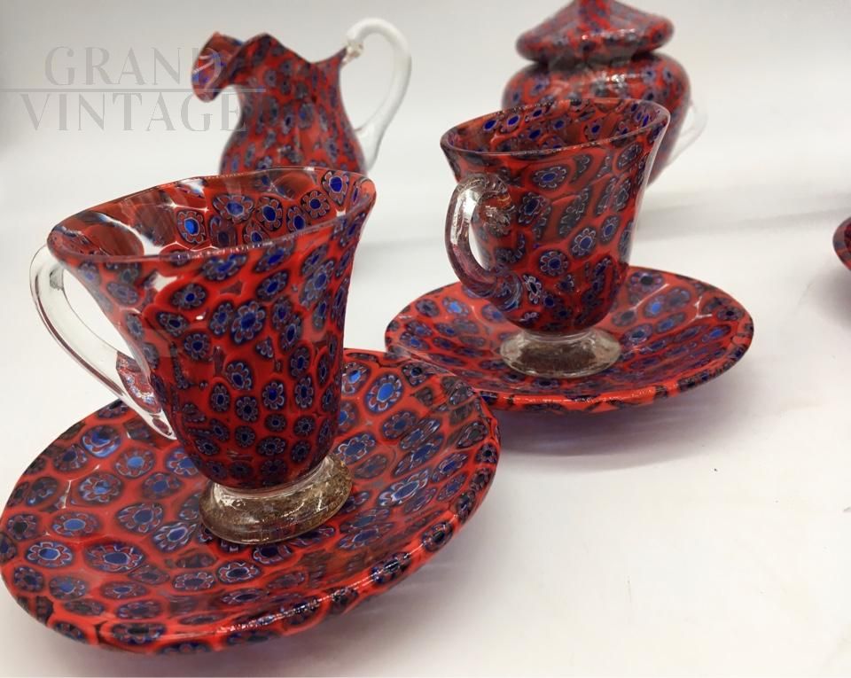 Set da caffè in vetro Murano vintage con Murrine, composto da 4 tazzine e 4 piattini, di cui uno con difetto (visibile in foto), una zuccheriera con coperchio, una caraffa con coperchio e una lattiera.