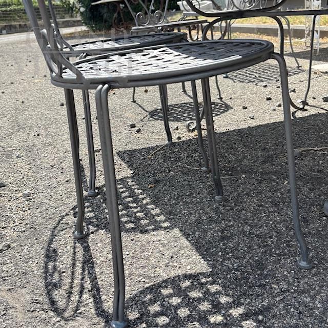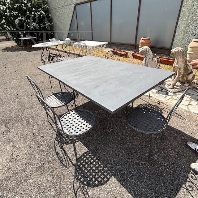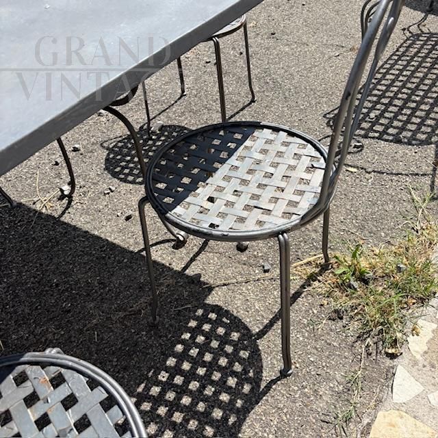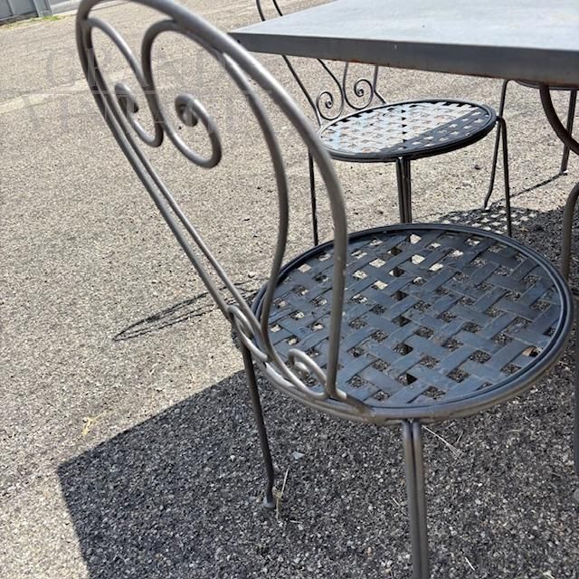 Bellissimo set da giardino vintage composto da un grande tavolo e sei sedie in ferro battuto realizzati a mano da maestri artigiani nel corso del XX secolo. Colore del ferro antracite. In buono stato di conservazione.