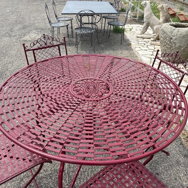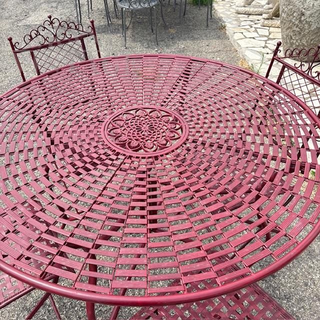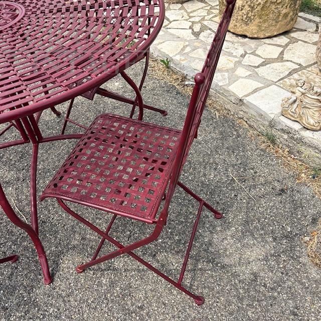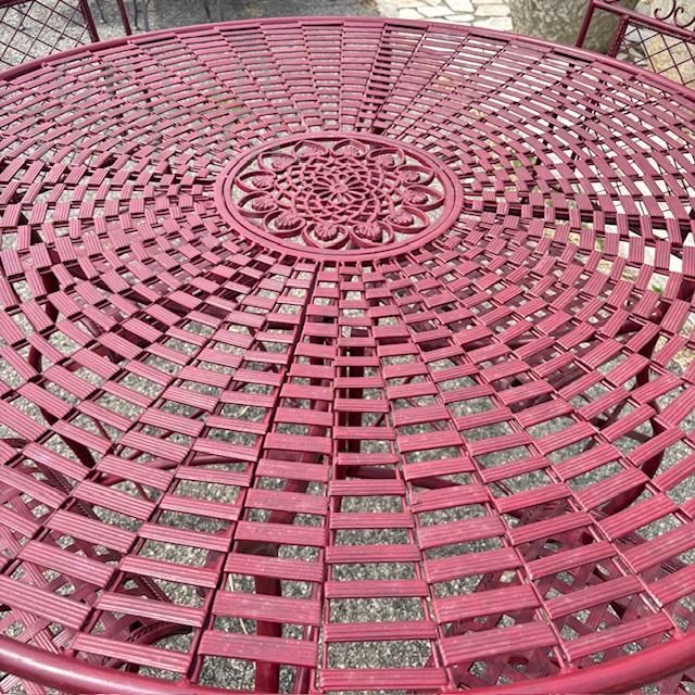 Set da giardino vintage composto da un tavolo rotondo e 4 sedie in ferro battuto laccato rosso porpora, Italia anni '70. In stato molto buono.