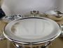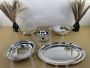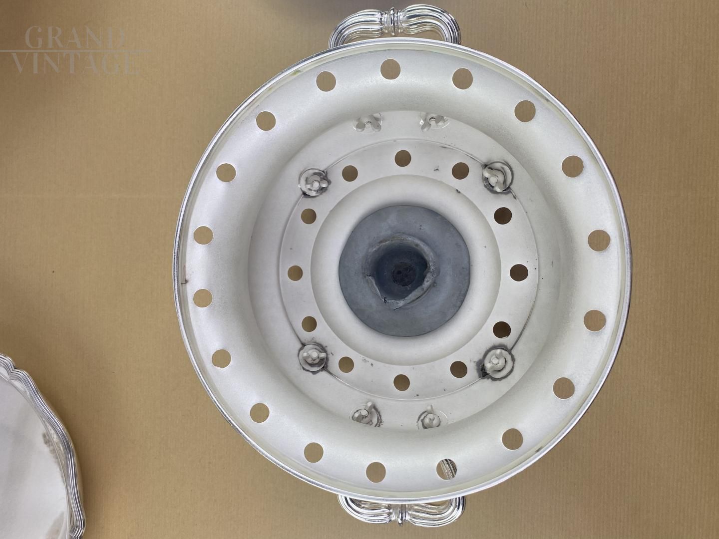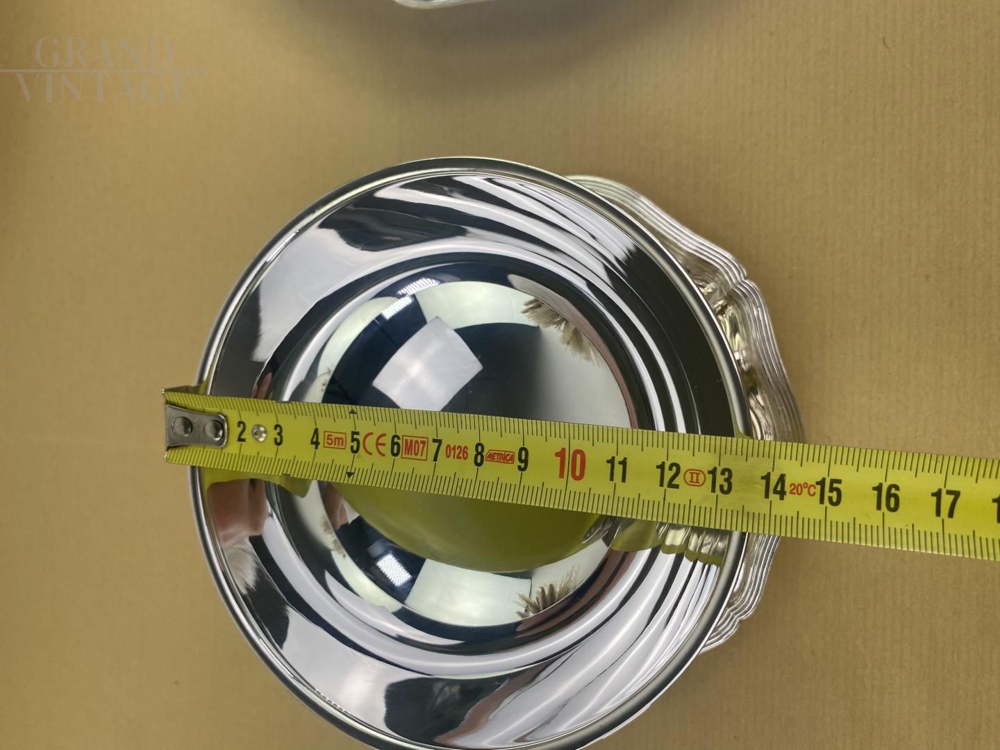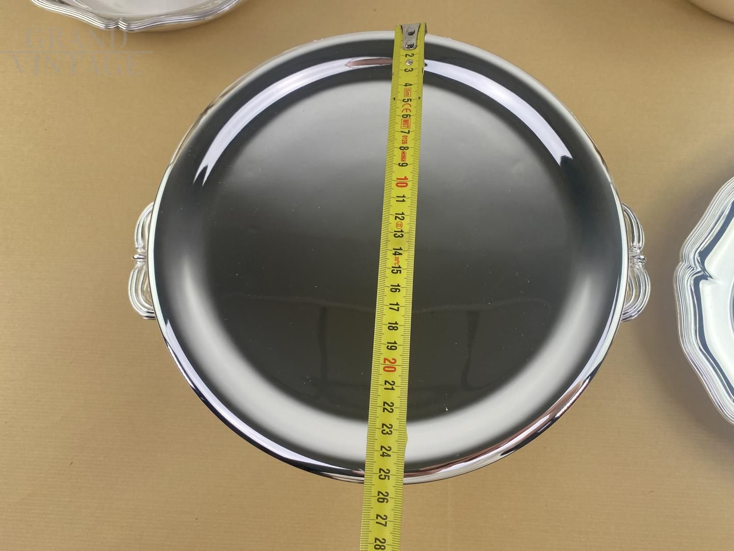 Bellissimo set da portata in metallo argentato della prima metà del '900, della nota maison francese Christofle, sinonimo di stile e qualità in tutto il mondo. Questo set è composto da: Un vassoio grande rotondo con diametro 27 cm, un vassoio grande ovale con larghezza 43 cm, una zuppiera con il rispettivo coperchio con altezza 8 cm e larghezza 24 cm, una salsiera con altezza 8 cm e larghezza 13 cm, uno scaldapiatti di 25 cm. Il servizio è pari al nuovo, come si nota molto bene anche dalle foto, di una lucentezza e bellezza rara.