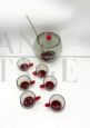 Bellissimo set servizio da caffè o da punch in vetro di Murano anni '30 attribuibile a Venini, composto da 6 tazzine e una caraffa o zuppiera con mestolo. Il vetro ha un bel colore grigio fumé e i dettagli, come i manici delle tazzine e il pomello del coperchio della zuppiera, sono in vetro rosso. C'è qualche sbeccatura, come da foto, ma nessuna crepa. Bello ed elegante, certamente raro.
