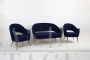 Elegante set da salotto vintage design anni '70 composto da due poltrone ed un divanetto con struttura originale con piedini in ottone e rivestimento in tessuto bouclé blu scuro. Provenienza: Italia.