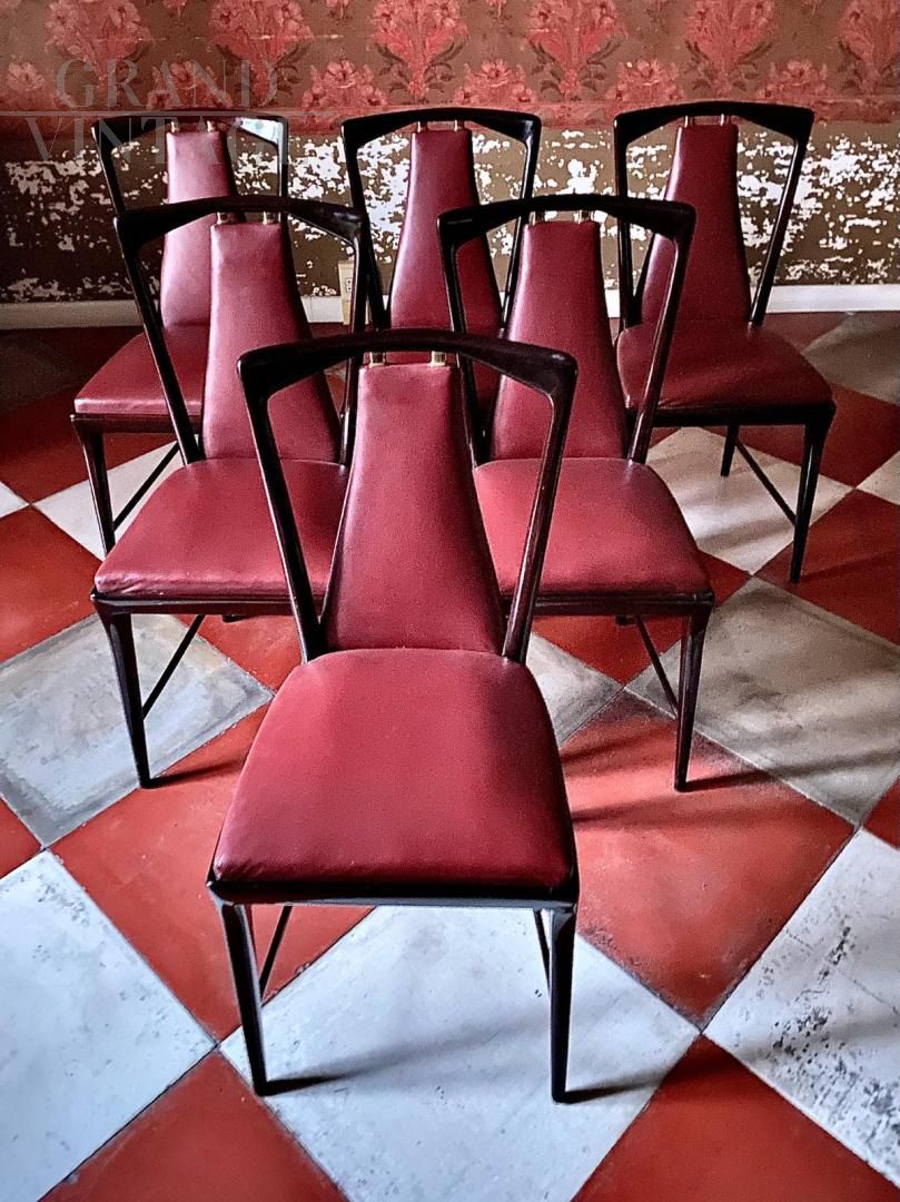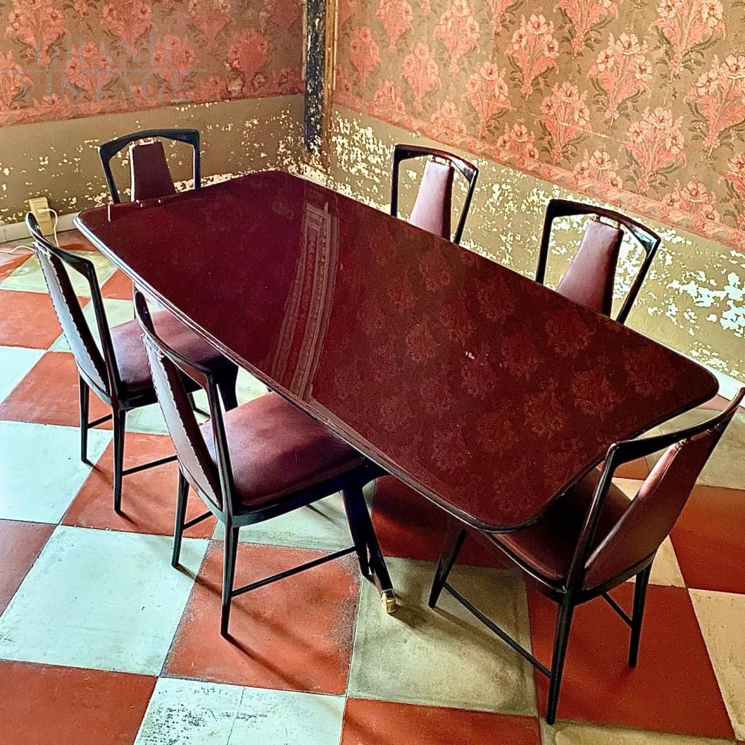 Set da soggiorno design di Osvaldo Borsani composto da un tavolo e sei sedie in mogano e palissandro, proveniente dall'Atelier Borsani Varedo, Italia anni '50. Elegante set da pranzo vintage composto da sei sedie in massello di mogano ed ecopelle rossa, e da un tavolo in legno di pioppo massello impiallacciato in palissandro di bella forma, con un piano in vetro opalino nero incastonato in una base con cornice in legno. Splendidi dettagli in ottone su sedie e tavolo. Il set è stato meticolosamente restaurato da esperti artigiani, ed è In ottime condizioni, con piccoli naturali segni del tempo.