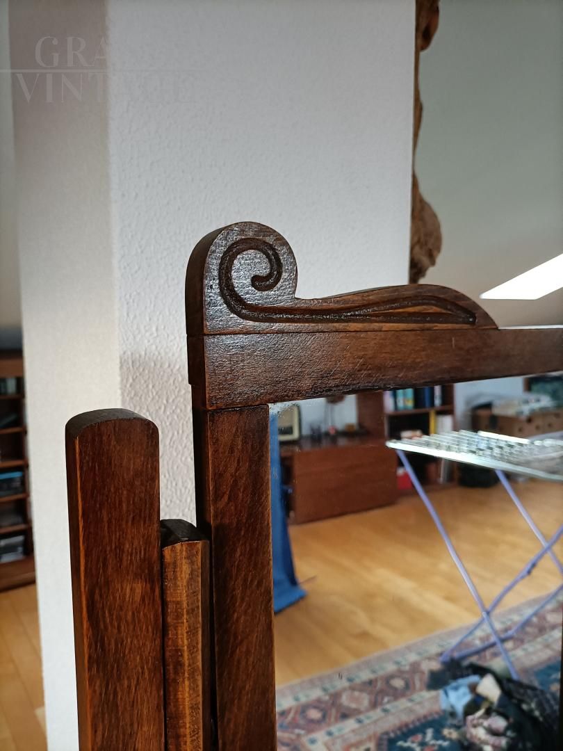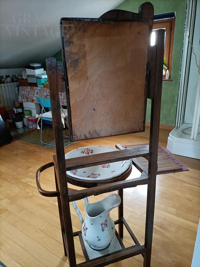 Toeletta da camera vintage in legno con catino e brocca originali in ceramica, specchio regolabile e portasciugamani su entrambi i lati. La brocca ha dei difetti visibili, come da foto, è stata recuperata e incollata in quanto rotta, e poggia su una piastrella, unico pezzo recente e non originale. Un pezzo elegante e originale per decorare una camera da letto o un bagno.