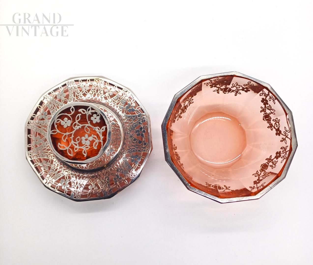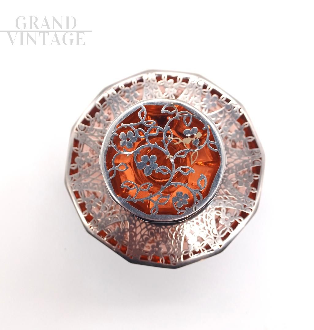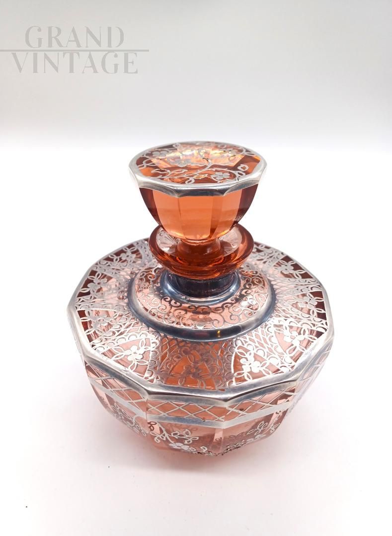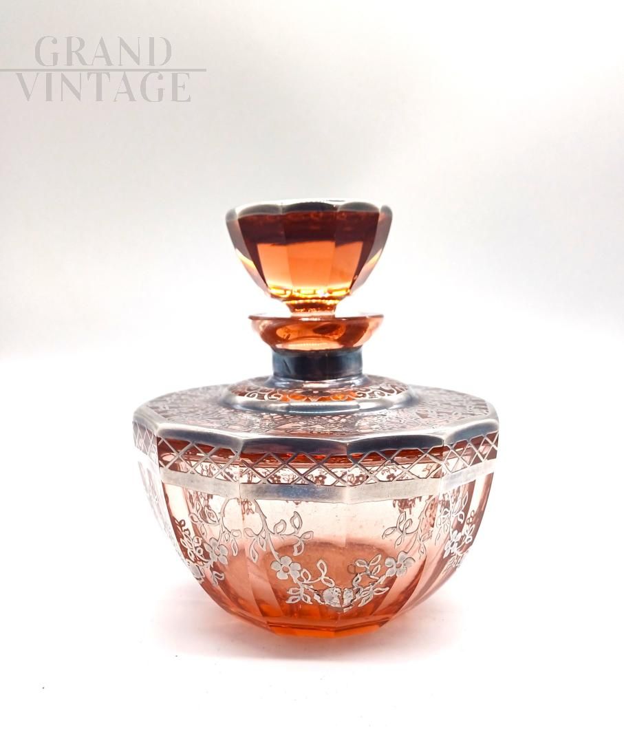 Raffinato set da toilette in stile Art Déco, anni '20, composto da tre pezzi in vetro soffiato color ambra / salmone con applicate elaborate decorazioni floreali e geometriche realizzate con lamine d'argento. Lotto composto da: