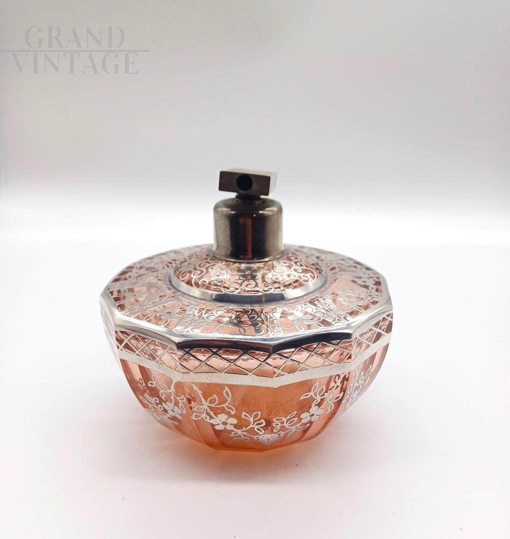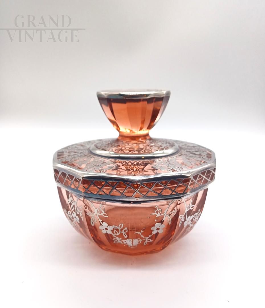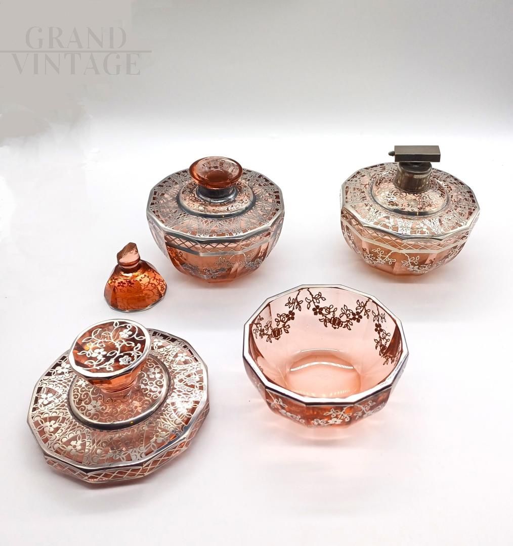 Set da toilette art déco in vetro soffiato rosa con lamina d'argento, anni '20