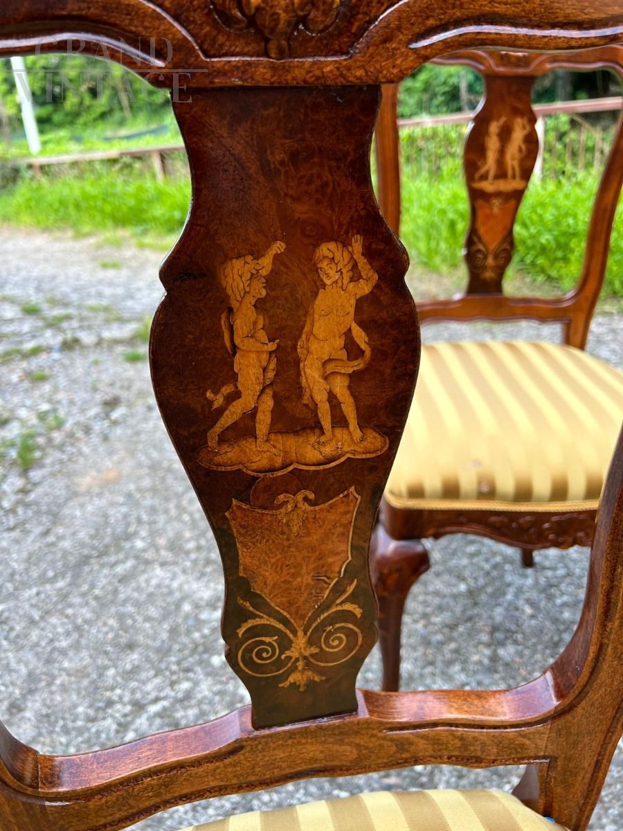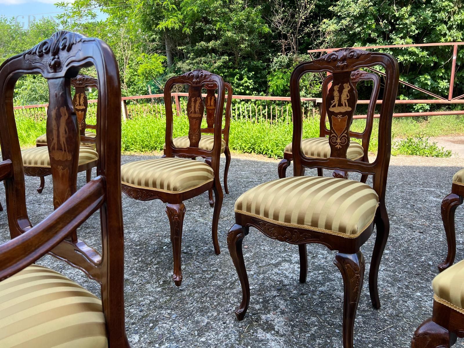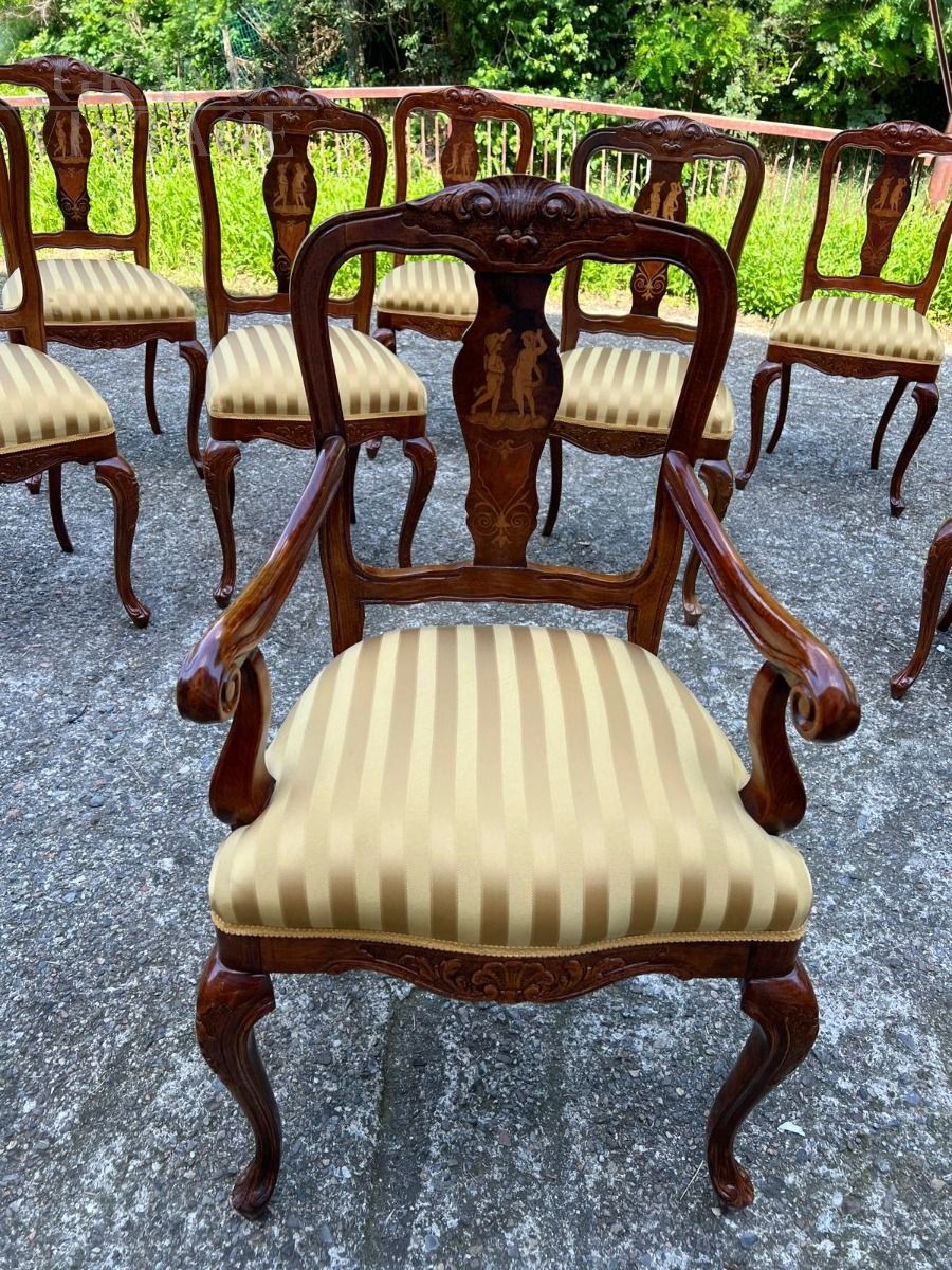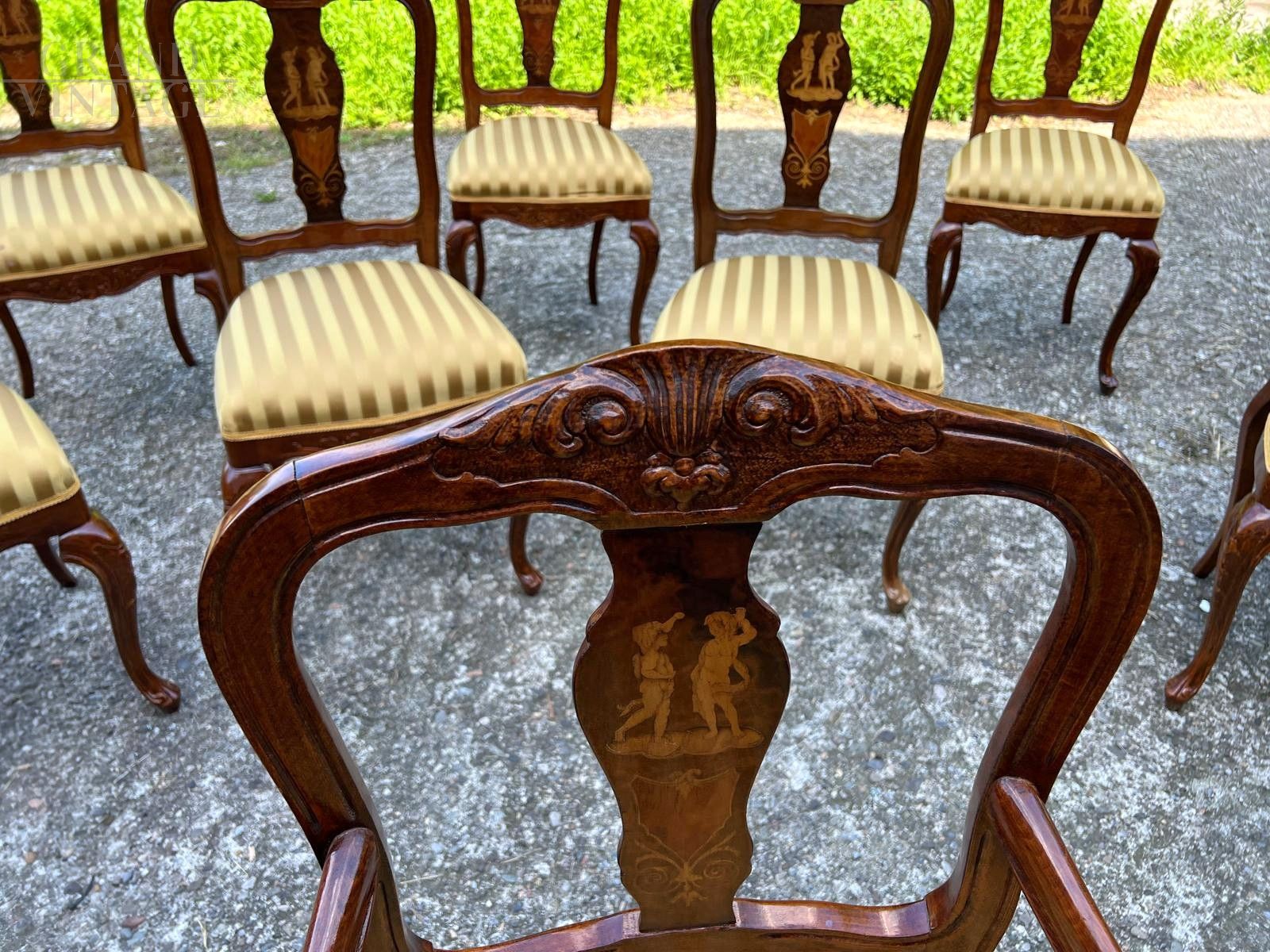 Set di 12 sedie + 2 capotavola palladiane intarsiate con putti allegorici