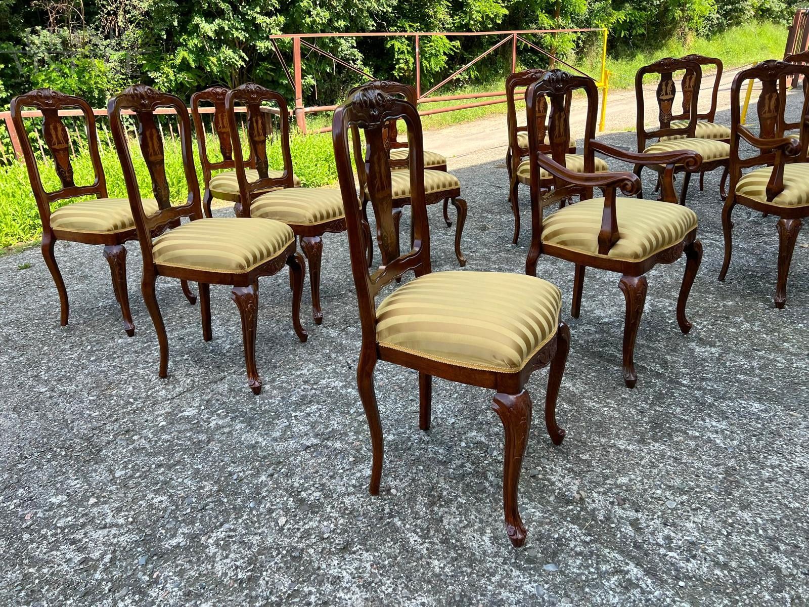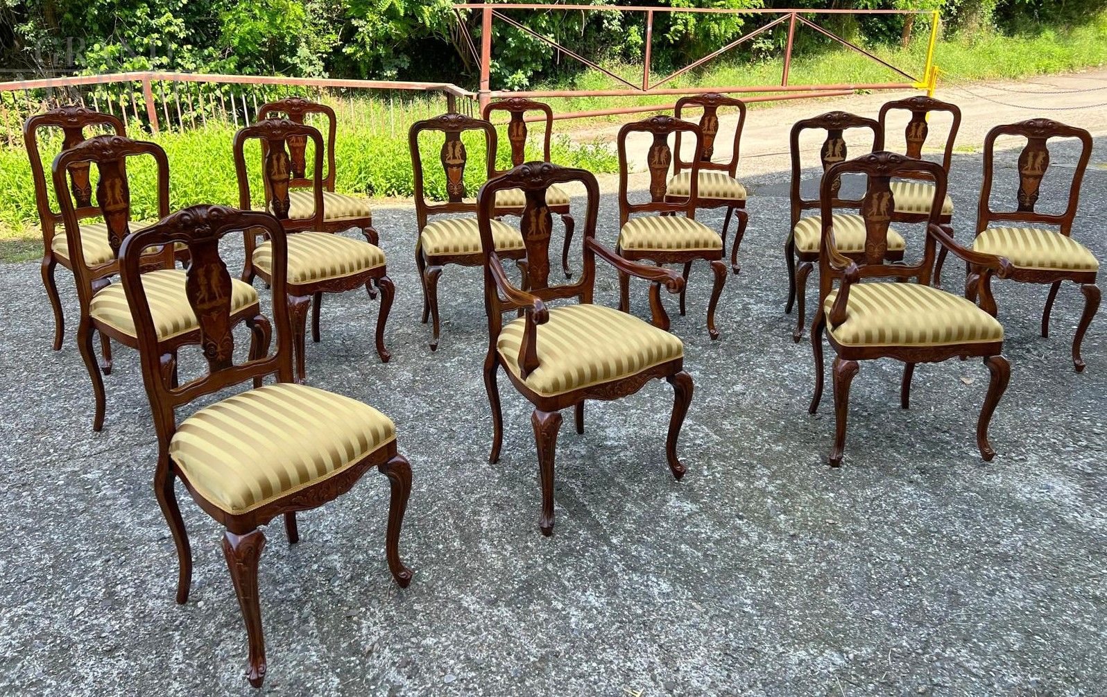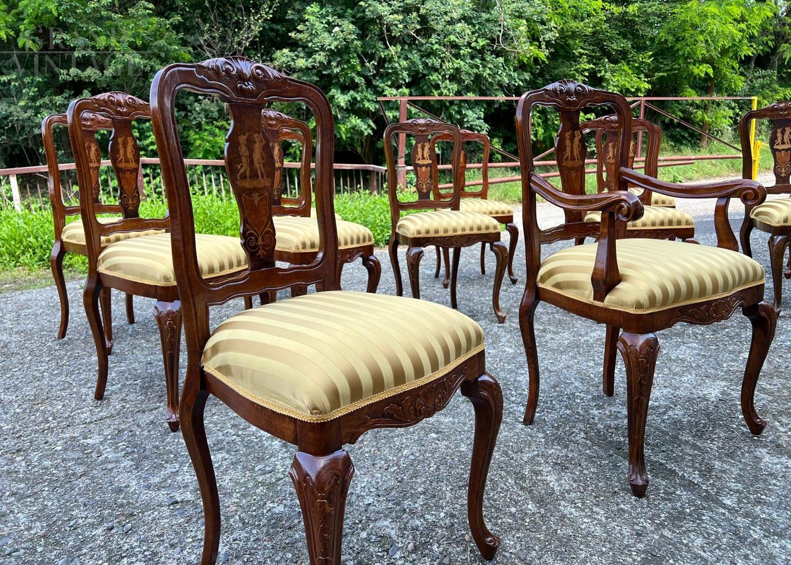 Set di 12 sedie + 2 capotavola palladiane intarsiate con putti allegorici