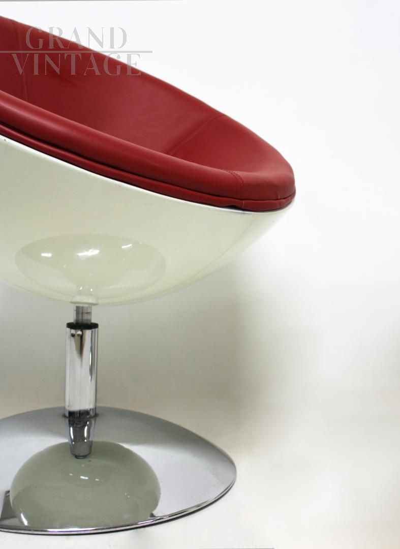 Coppia di poltrone a sfera in stile space age girevoli, anni '70, con base in acciaio, struttura a bolla in fibra di vetro bianca e seduta imbottita in pelle rossa. Un design iconico tipico dell'Italia nell'era spaziale.