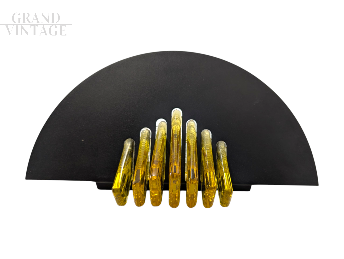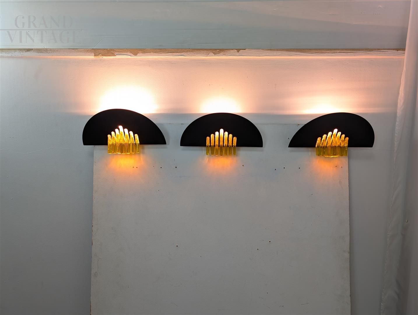 Tris di applique vintage di AV Mazzega degli anni '80 con struttura in ferro nero e dettagli in vetro di Murano giallo. Testate e funzionanti, godono di un ottimo stato di conservazione. Dimensioni 18 x 32 x 14 cm (altezza, larghezza, profondità)