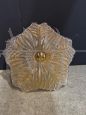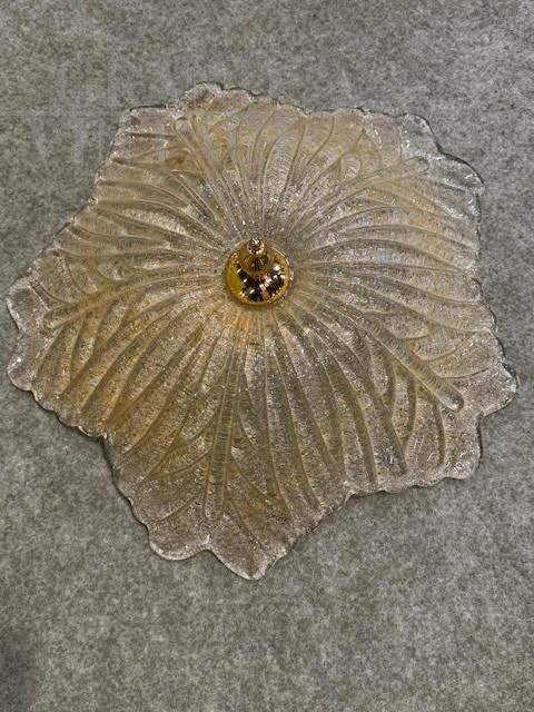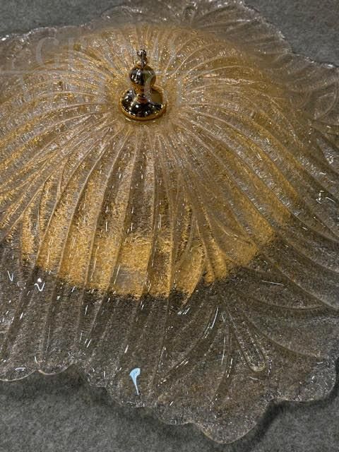 Set di tre plafoniere veneziane a forma di fiore interamente realizzate a mano in vetro di Murano attribuibili alla manifattura di Aureliano Toso. Alta la qualità artigianale e dei dettagli costruttivi. Il vetro soffiato di murano è in colore ambrato con texture in oro con una sofisticata granulata al loro interno tipica dello stile veneziano. la struttura è in metallo e il fissaggio avviene mediante elegante pomello centrale in ottone a vista.