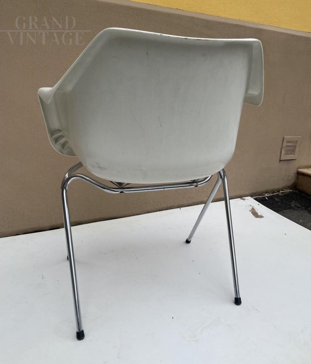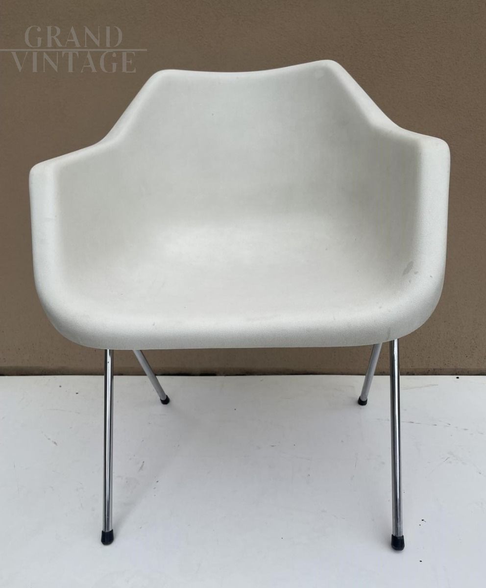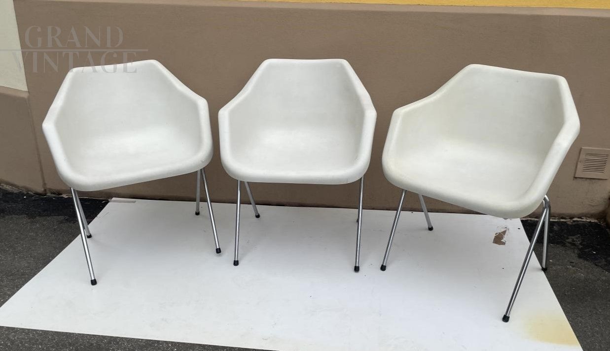 Set di tre poltroncine design di Robin Day per Castelli su licenza di Hille, con struttura in moplen bianco e gambe in acciaio, Italia anni '70. In condizioni perfette.
