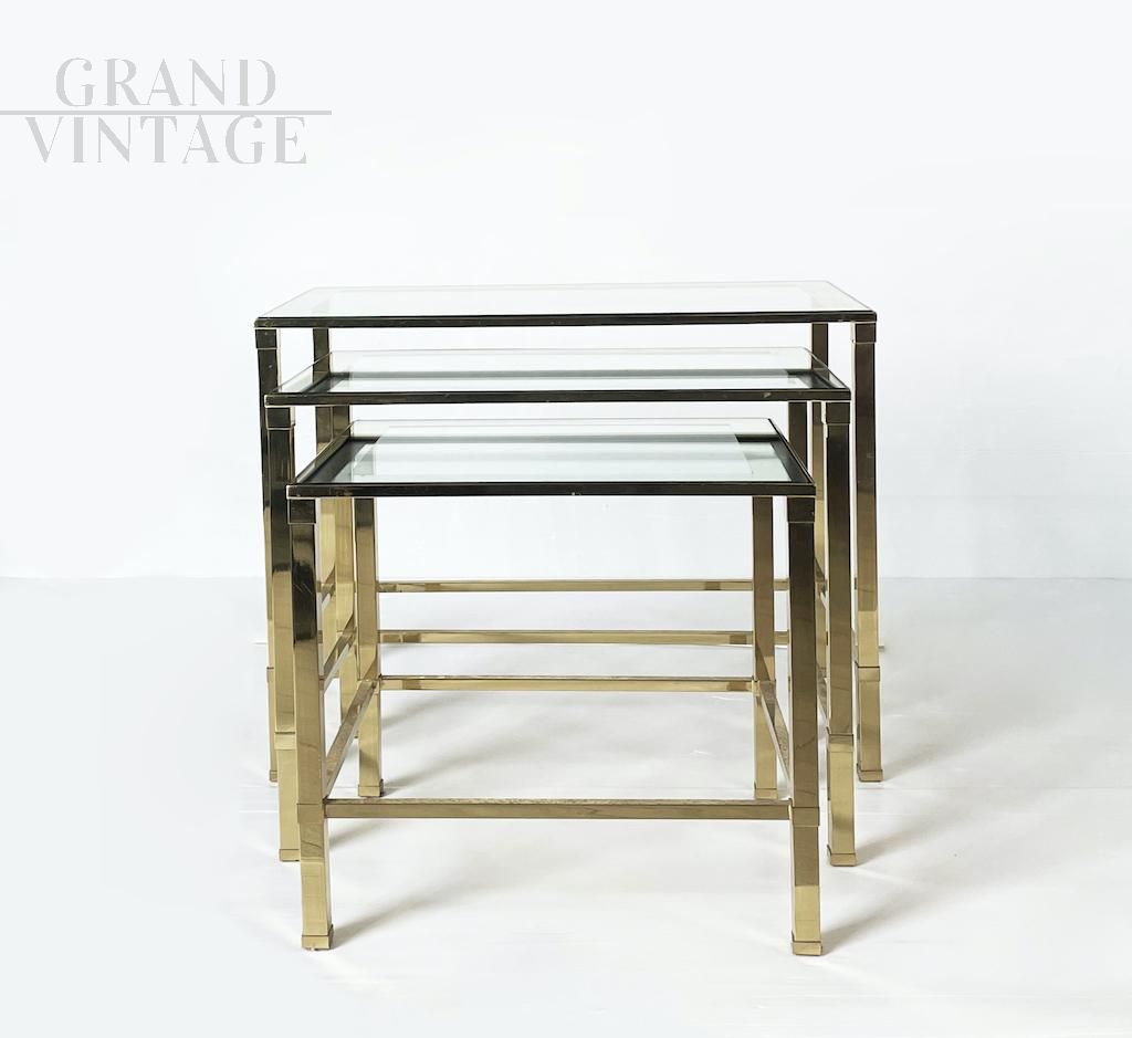 Particolare set di tre tavolini vintage impilabili a nido degli anni '70 in ottone dorato con superfici in vetro con perimetro specchiato, molto eleganti. Il set è caratterizzato dalla presenza di tre elementi mobili di diverse misure, realizzati in modo da essere perfettamente e armonicamente sovrapponibili tra loro. Leggeri segni del tempo presenti, evidenziati in foto.