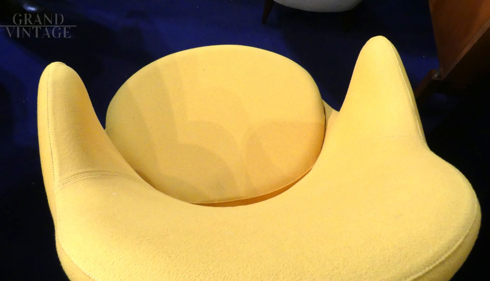 Set di 4 poltroncine girevoli di Titina Ammannati e Giampiero Vitelli per Brunati, in bellissimo tessuto giallo originale. Le poltroncine sono in perfette condizioni poichè nuove, provenienti da un fondo di magazzino. Restano comunque un articolo ricercato perchè questo modello è fuori produzione. Il set è completo di foglietto originale, a garanzia dell'originalità.