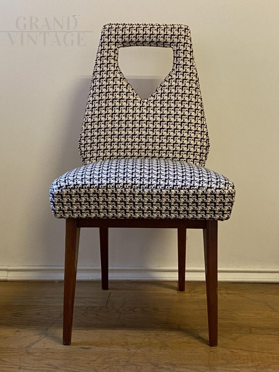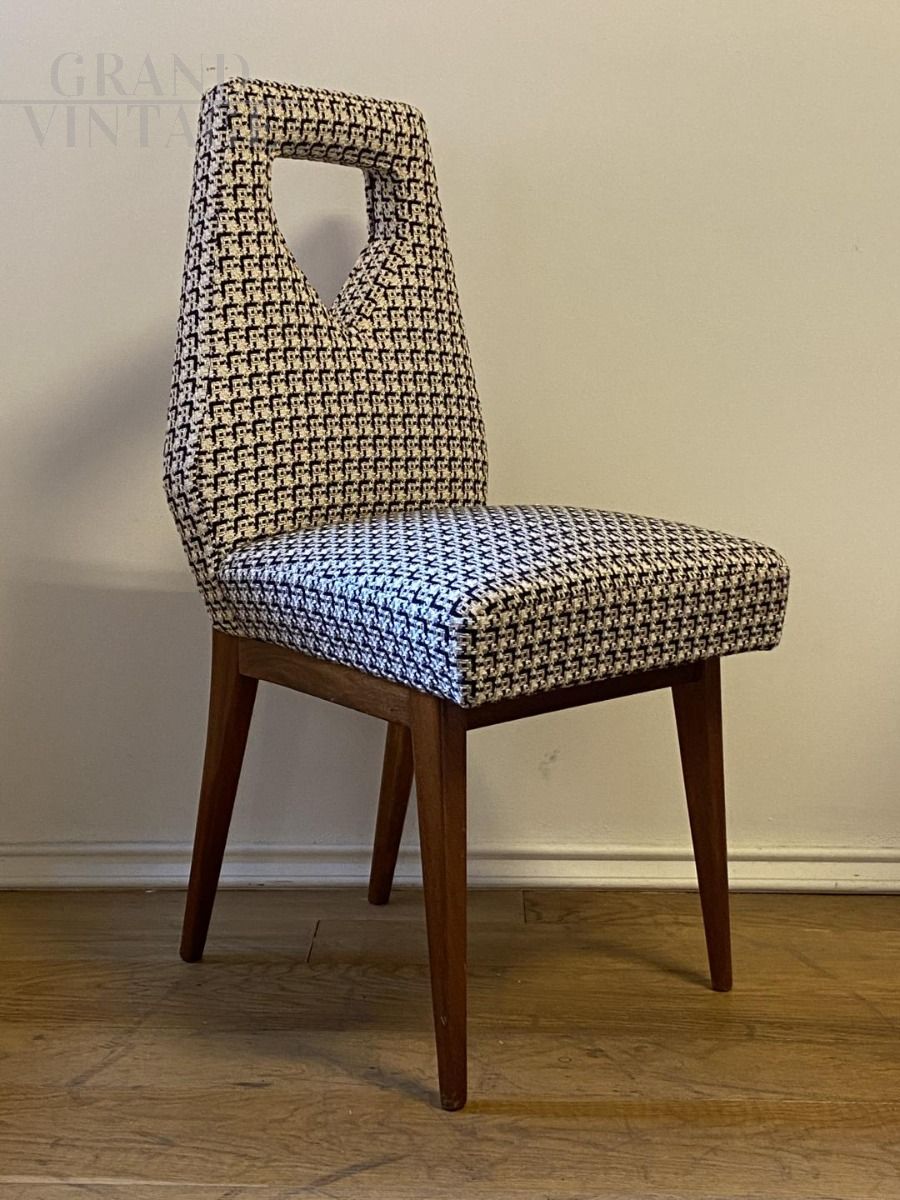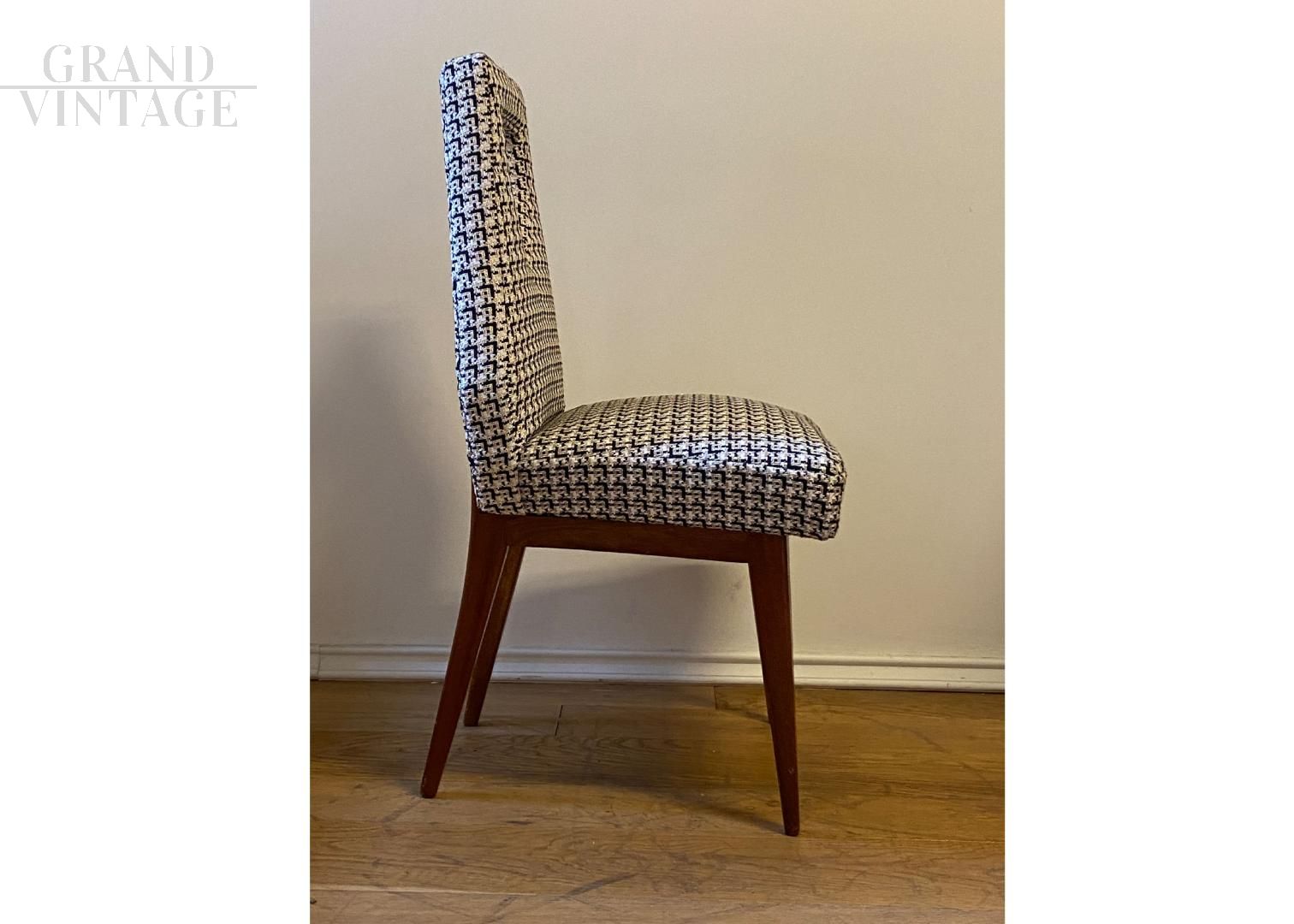 Set di 4 sedie anni '50 di produzione italiana caratterizzate da una base con gambe in mogano e dallo schienale di forma geometrica. Recentemente restaurate per quanto riguarda imbottitura e rivestimento. Il tessuto è Cherie di Dedar in colore bianco e nero.