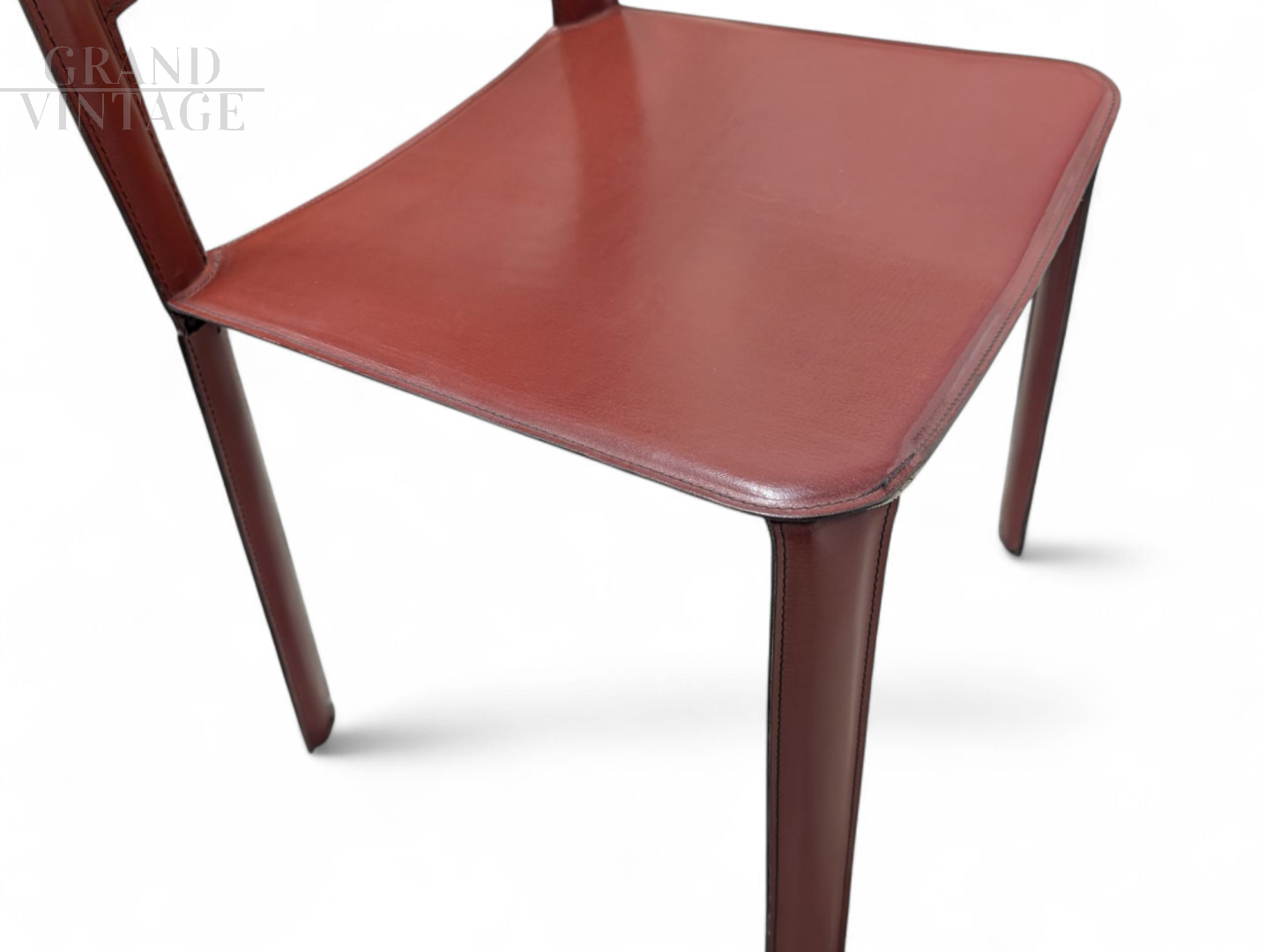 Proponiamo un elegante set di 4 sedie originali Cidue degli anni '70, autentiche espressioni del design italiano modernista. Le sedie si presentano in ottimo stato di conservazione, sia strutturalmente che esteticamente, mantenendo la loro forma originale e il fascino tipico del periodo. Possono presentare lievi segni di utilizzo ma che non rovinano l'impatto visivo ed estetico. Realizzate con struttura interamente rivestita in cuoio rosso bordeaux, queste sedute sono caratterizzate da un design minimalista ma deciso, con linee pulite, profili arrotondati e uno schienale basso con apertura centrale che conferisce leggerezza visiva e comfort. Il cuoio è ben conservato, con una finitura lucida che valorizza l’aspetto retrò e l’alta qualità dei materiali utilizzati.