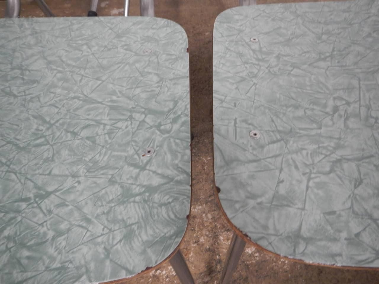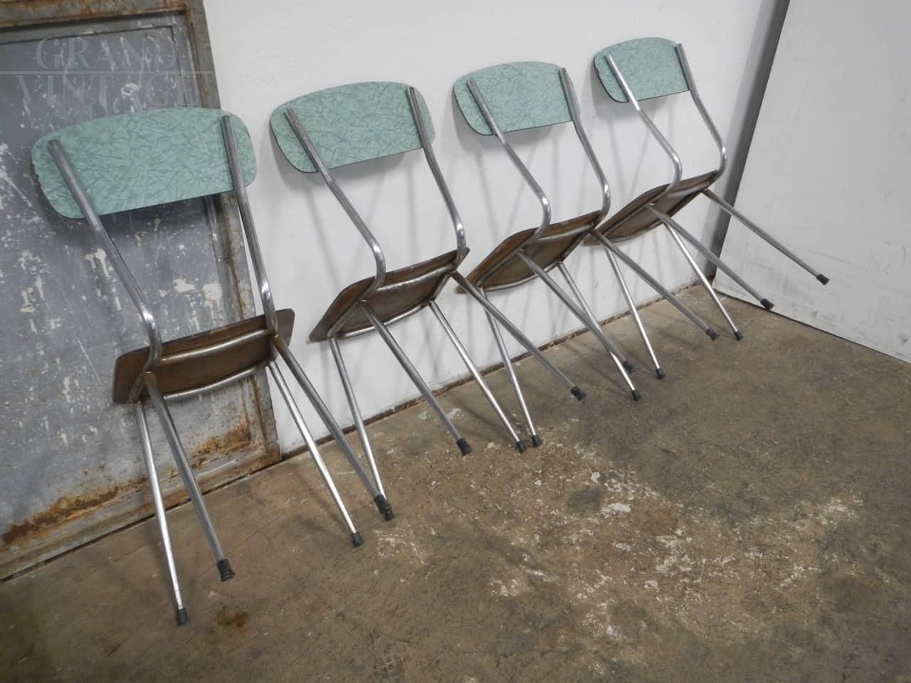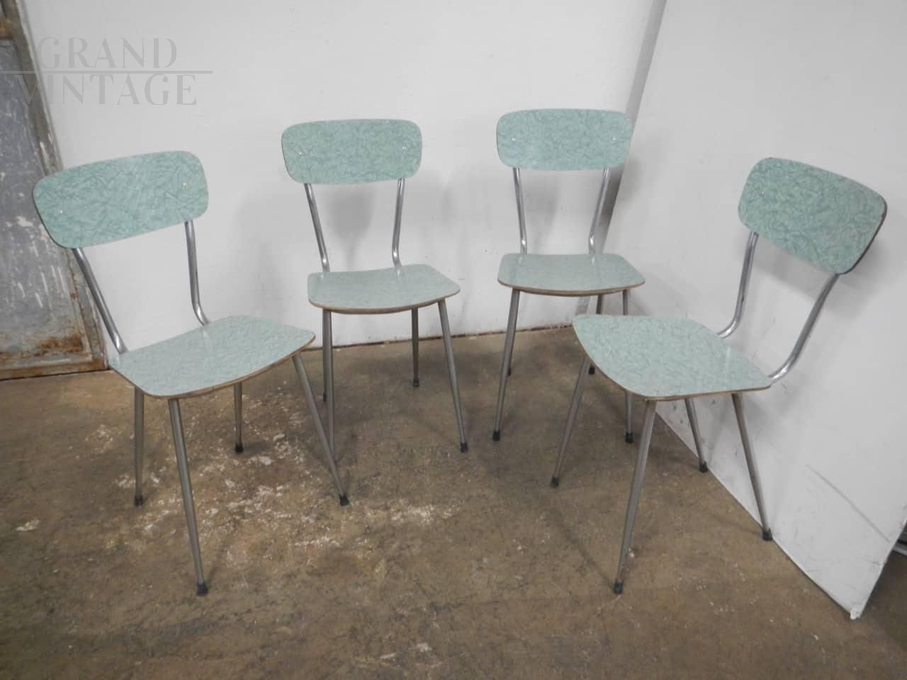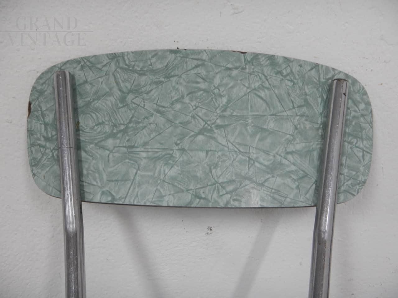 Set di 4 sedie da pranzo vintage in formica verde maculata con struttura in metallo verniciato grigio. Lievi difetti evidenziati nelle foto. La seduta misura cm 45.