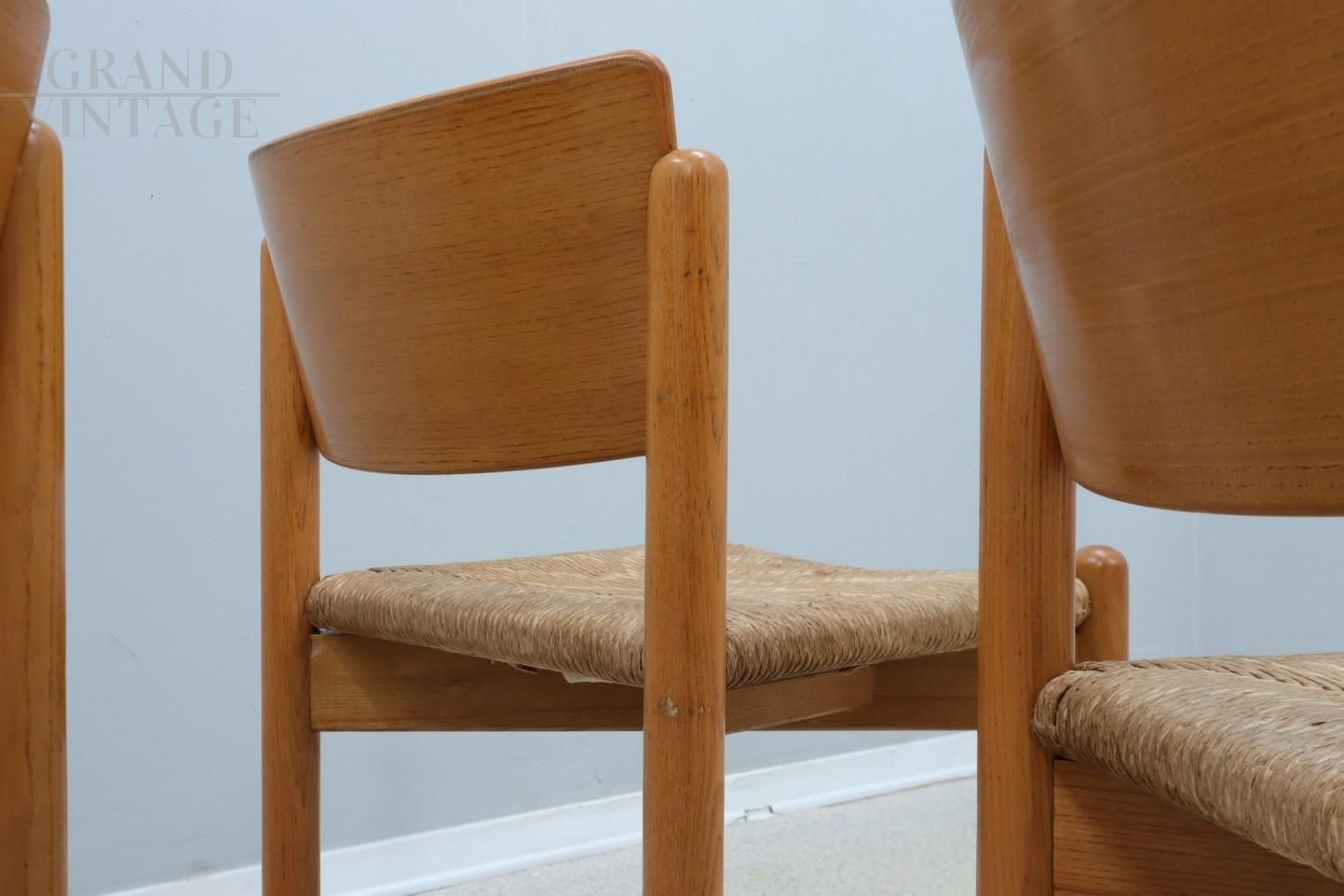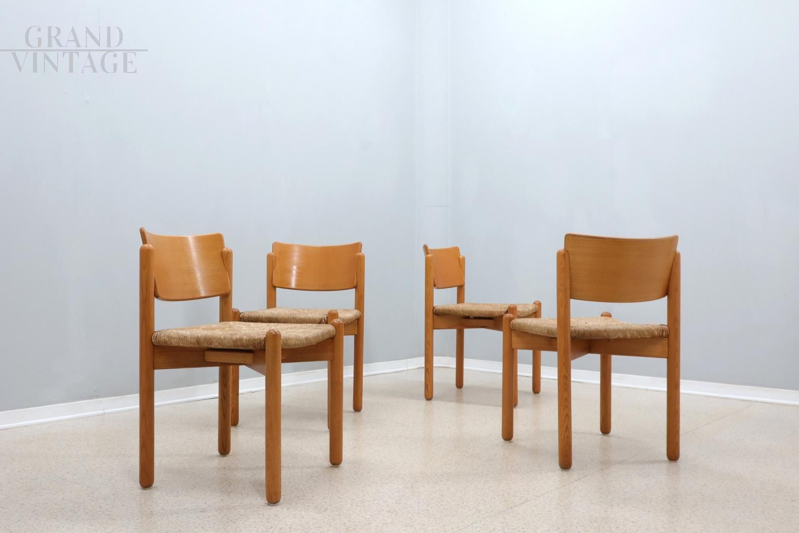 Set originale di 4 sedie da pranzo vintage dal sapore rustico ma dalla linea raffinata, chiaramente ispirata ai disegni dell'architetto francese Charlotte Perriand e prodotta in Italia negli anni '70 su disegno attribuito a Roberto Pamio e Renato Toso. Le sedie sono realizzate in legno massello di rovere con seduta in paglia intrecciata. Il set rimane in ottime condizioni vintage coerenti con l'uso e l'età. E' stato effettuato un restauro conservativo, sono quindi robuste e comode da usare tutti i giorni. Questo set da collezione di sedie italiane è pronto per arredare la vostra casa, studio o ufficio!